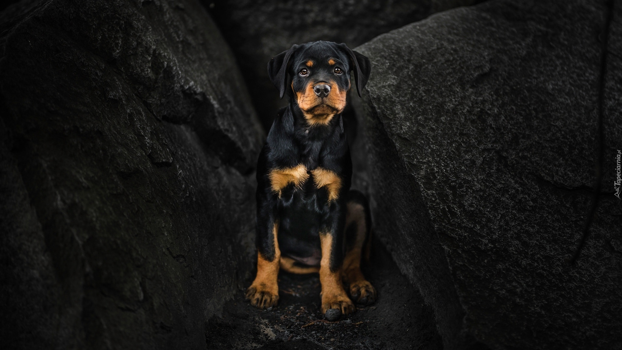 Edytor tapety: Szczeniak rottweilera siedzi między skałami