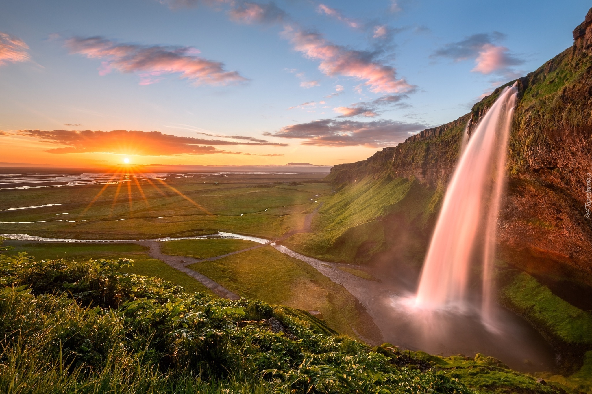 Edytor tapety: Wodospad Seljalandsfoss w Islandii w promieniach zachodzącego słońca