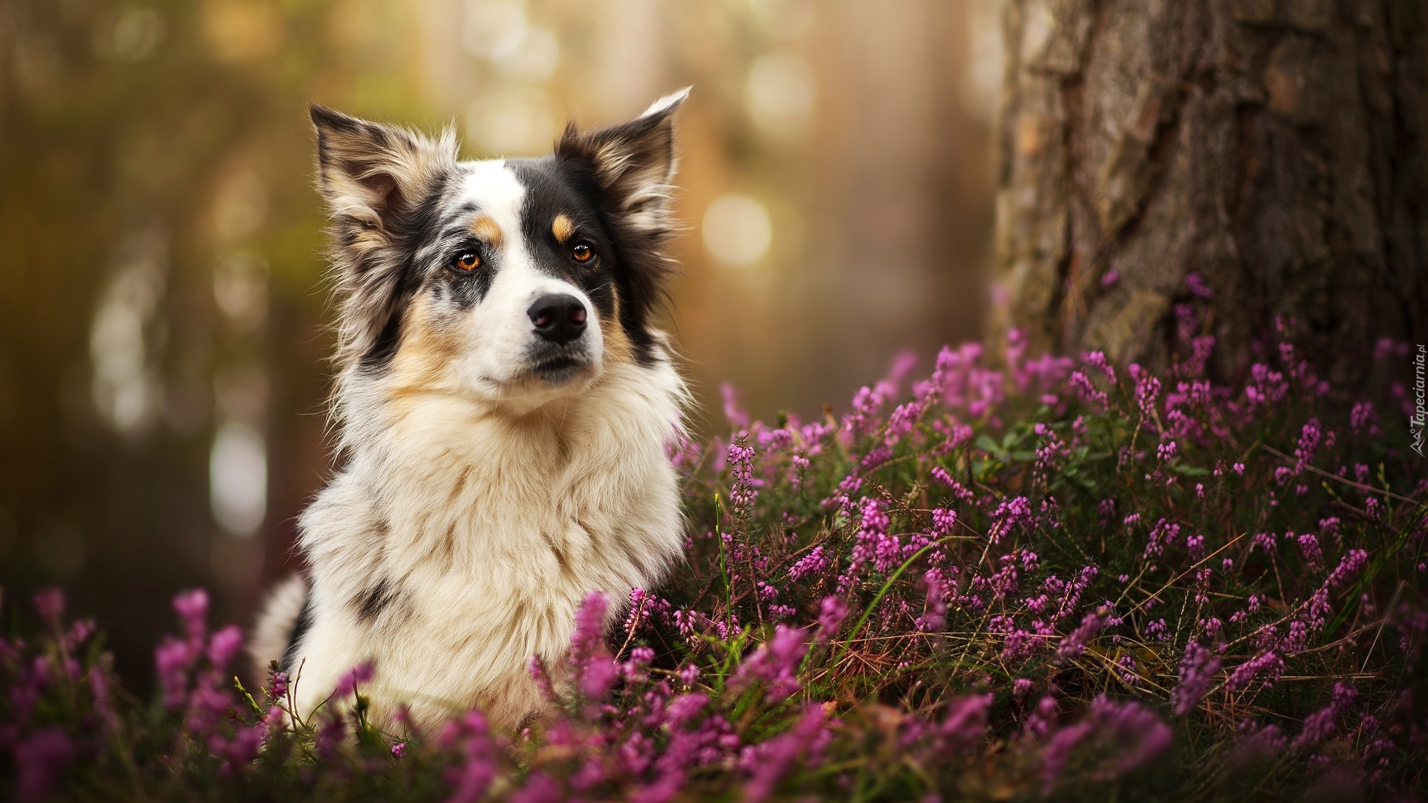 Edytor tapety: Owczarek australijski we wrzosach pod drzewem