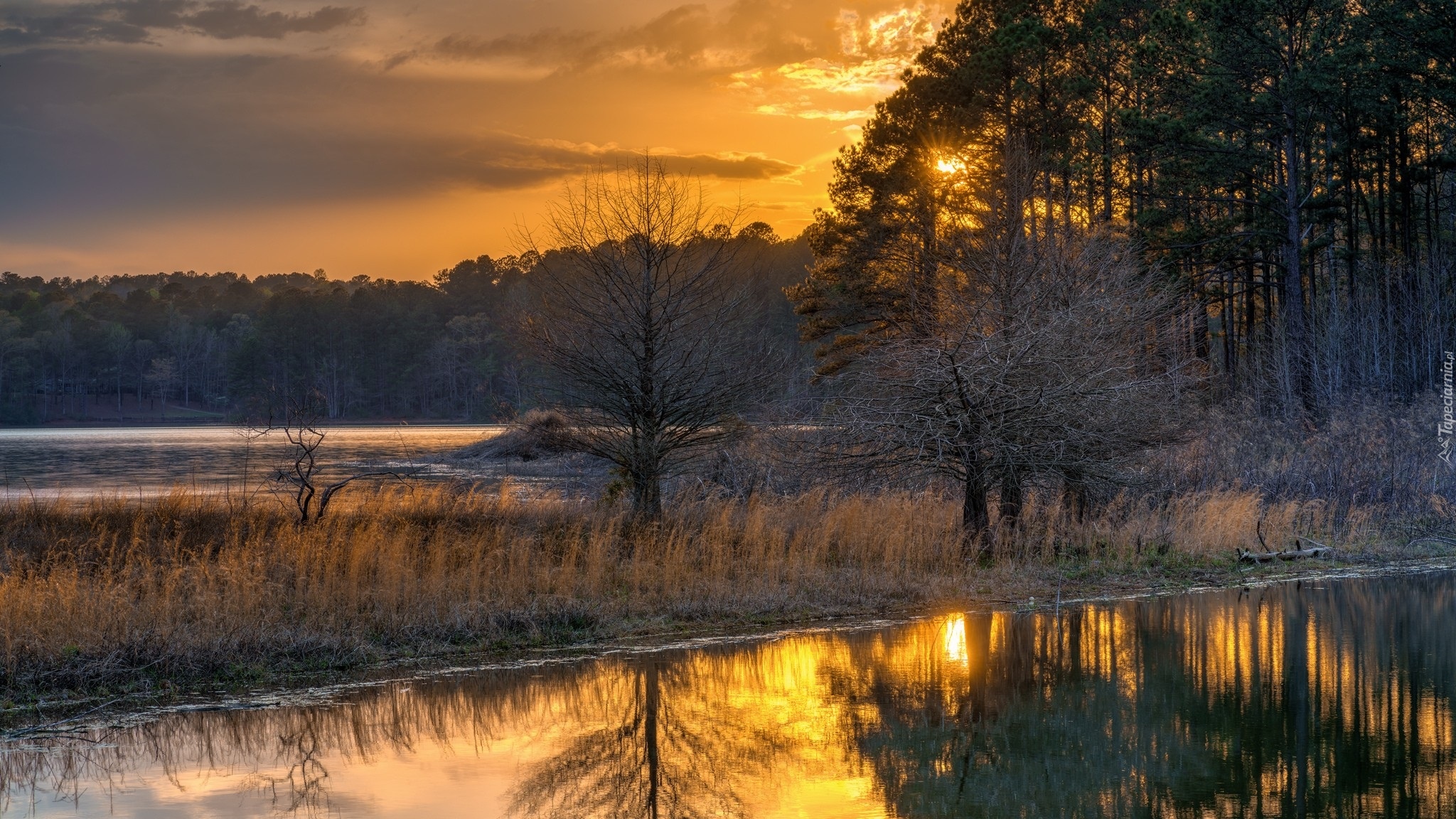 Edytor tapety: Zachodzące słońce między drzewami nad rzeką