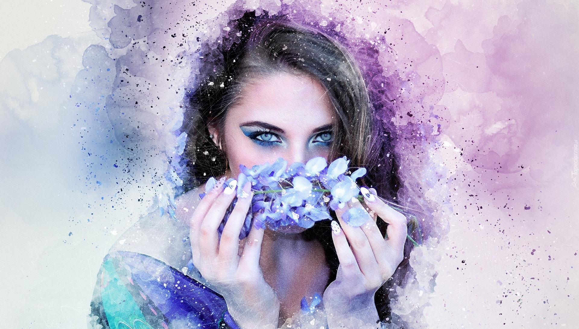Edytor tapety: Kobieta z kwiatami przy twarzy w grafice paintography