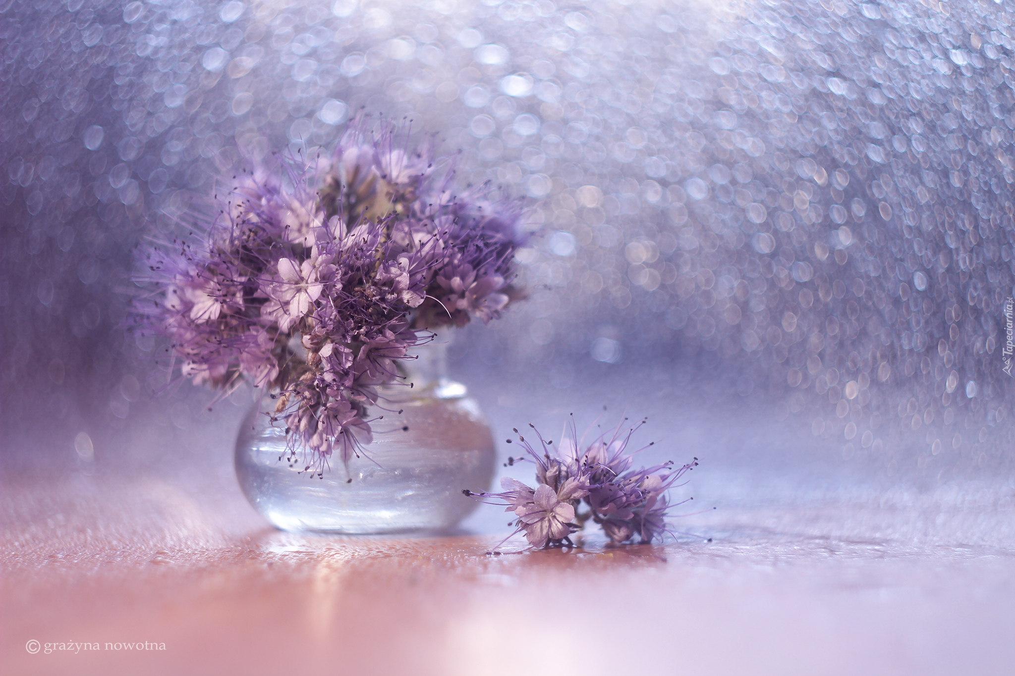 Edytor tapety: Bukiet kwiatów facelii błękitnej w szklanym wazoniku