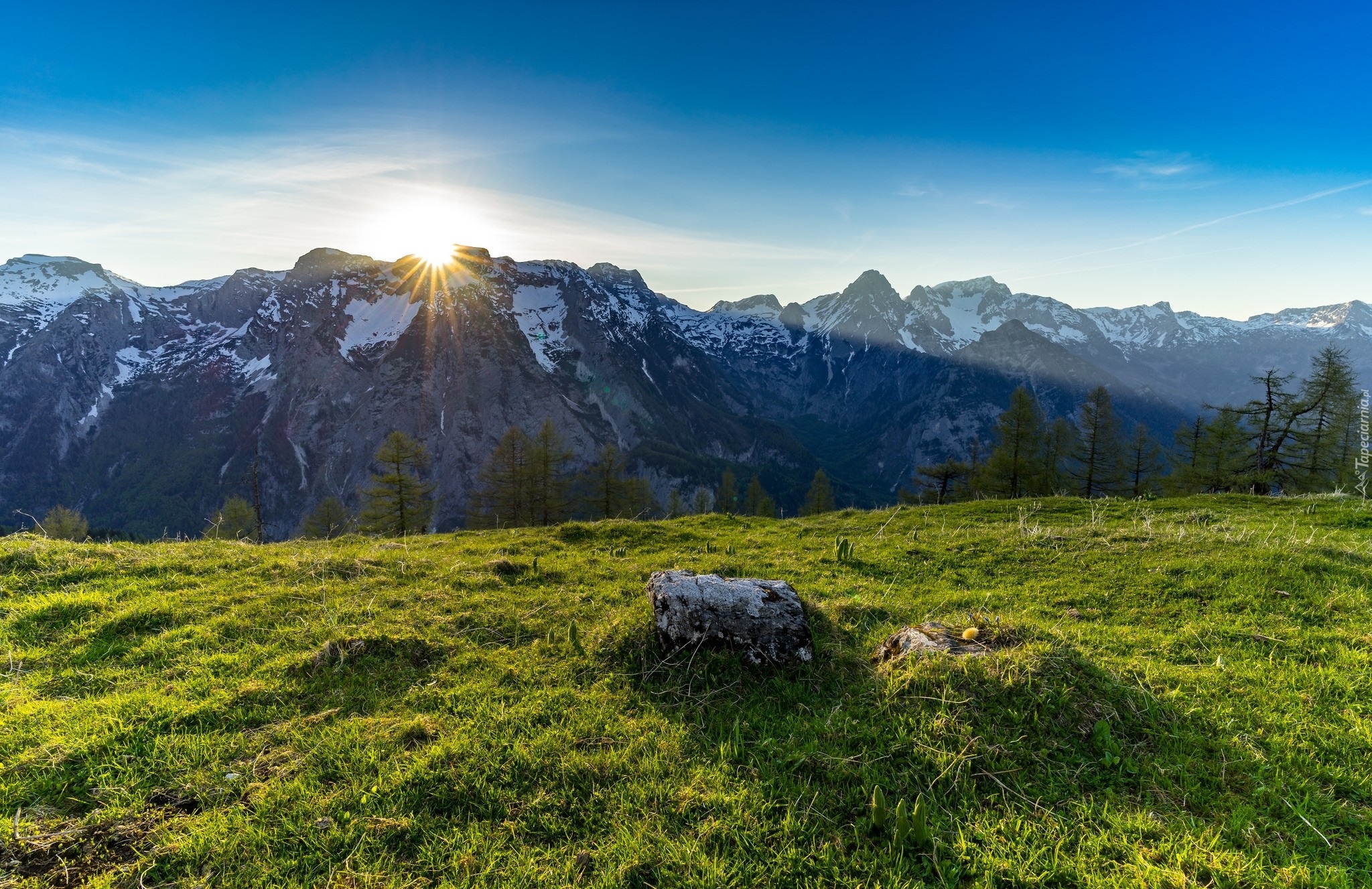 Edytor tapety: Promienie słońca padają zza gór na zieloną łąkę