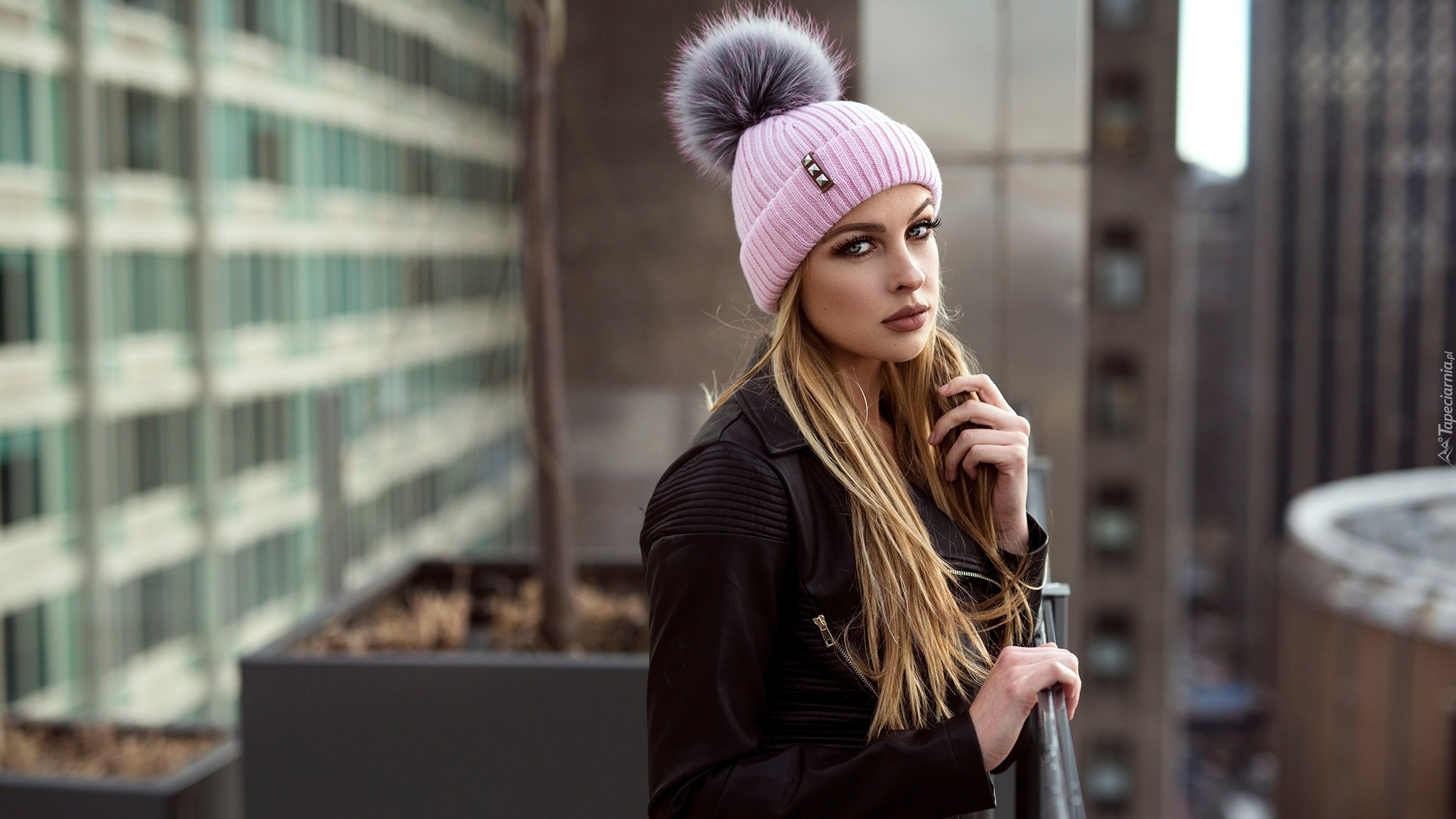 Edytor tapety: Blondynka w różowej czapce z pomponem
