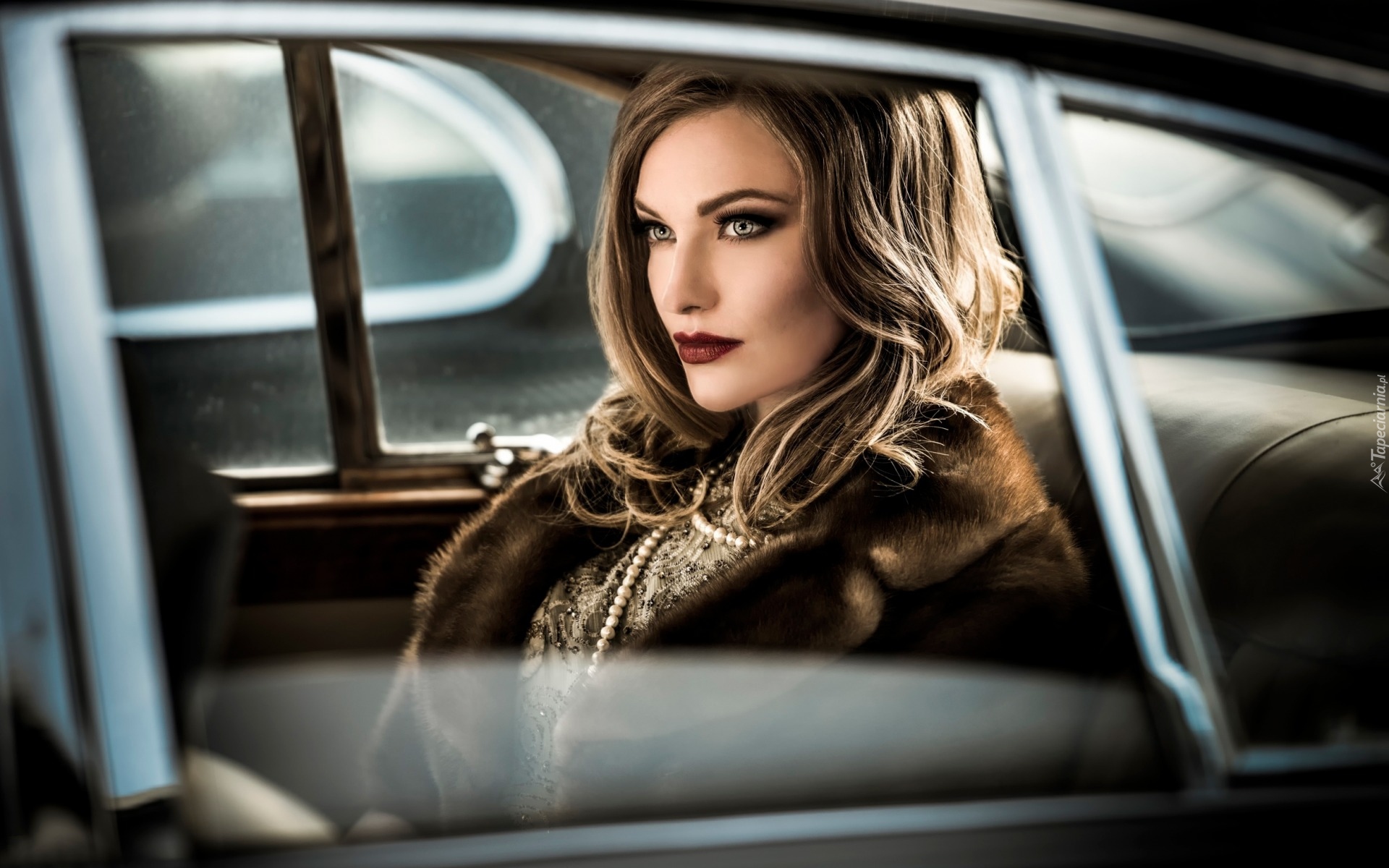 Edytor tapety: Kobieta w futrze i koralach w samochodzie