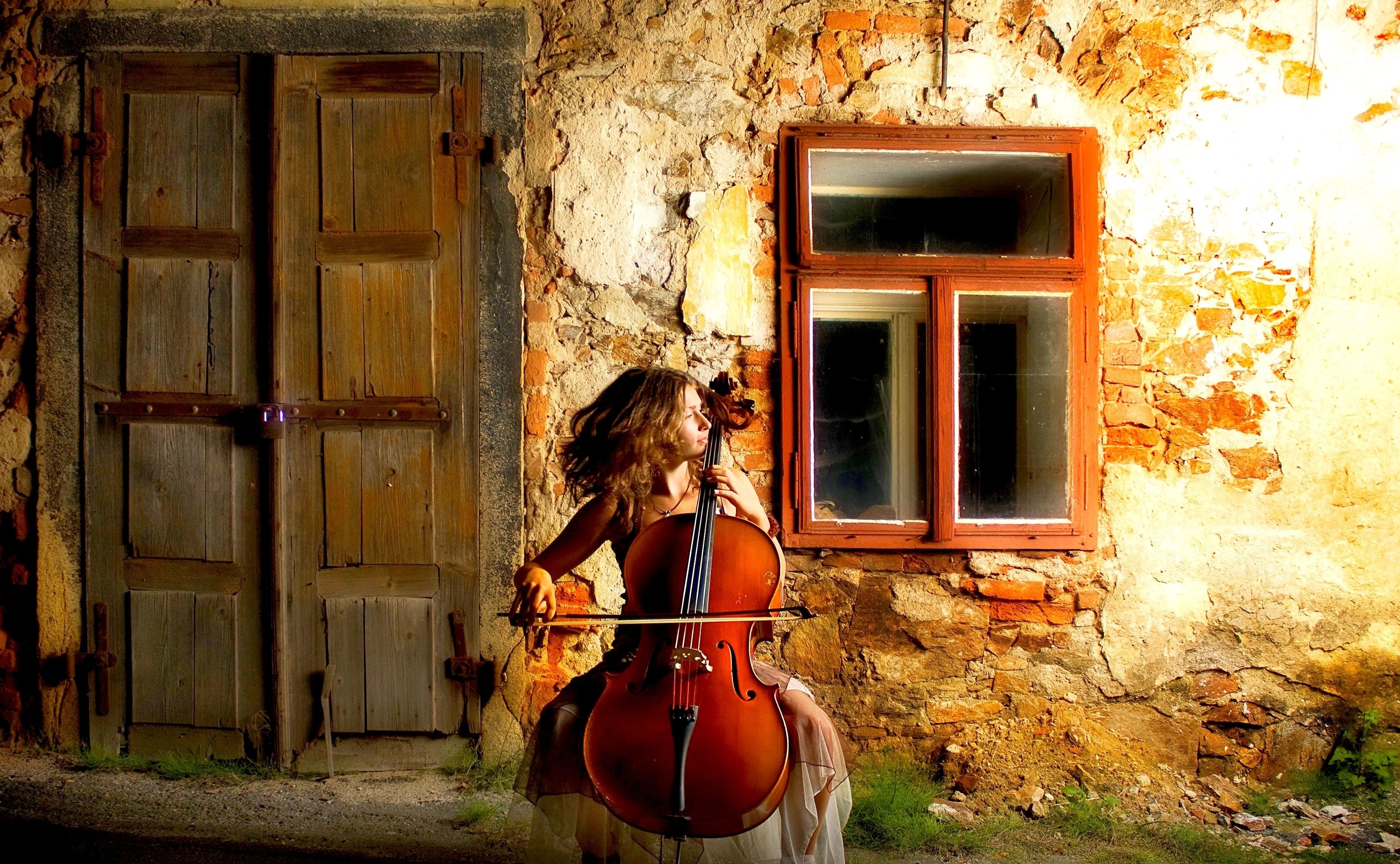 Edytor tapety: Dziewczyna z wiolonczelą przed starym zniszczonym domem