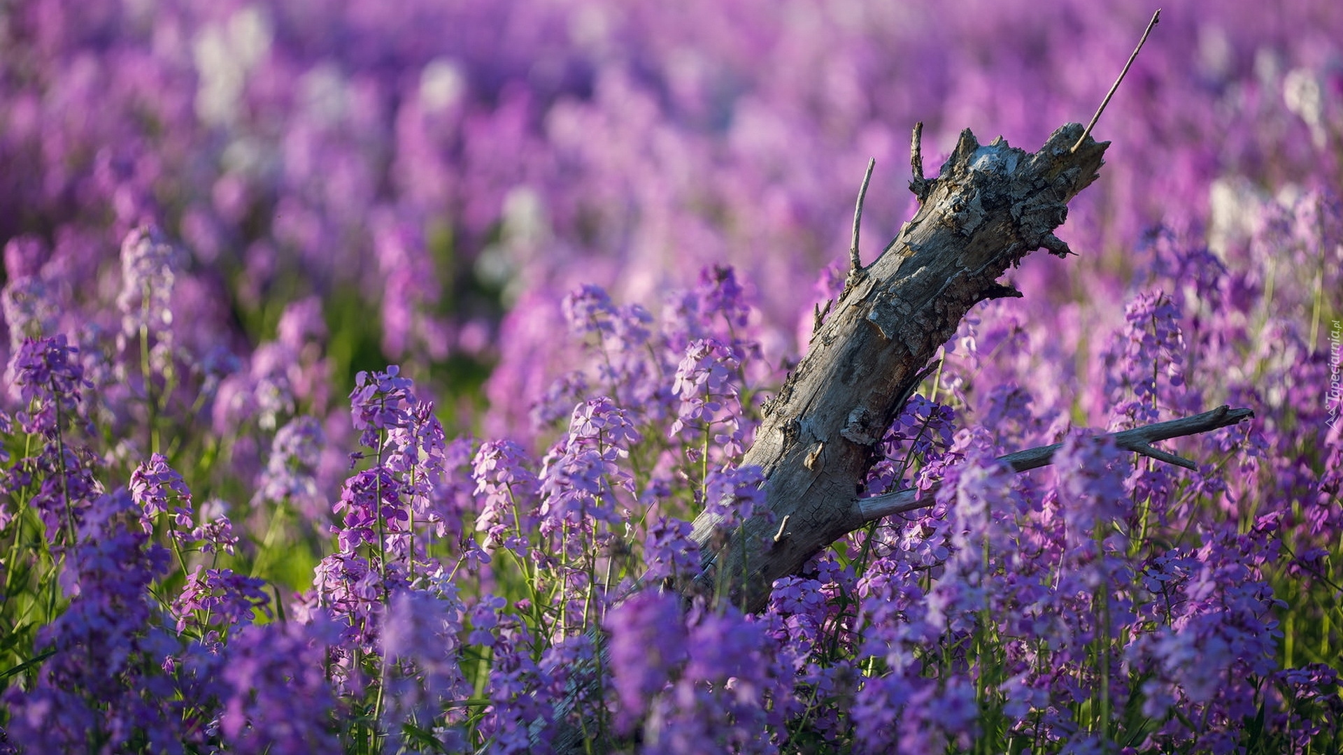 Edytor tapety: Złamany konar wystający spomiędzy fioletowych kwiatów