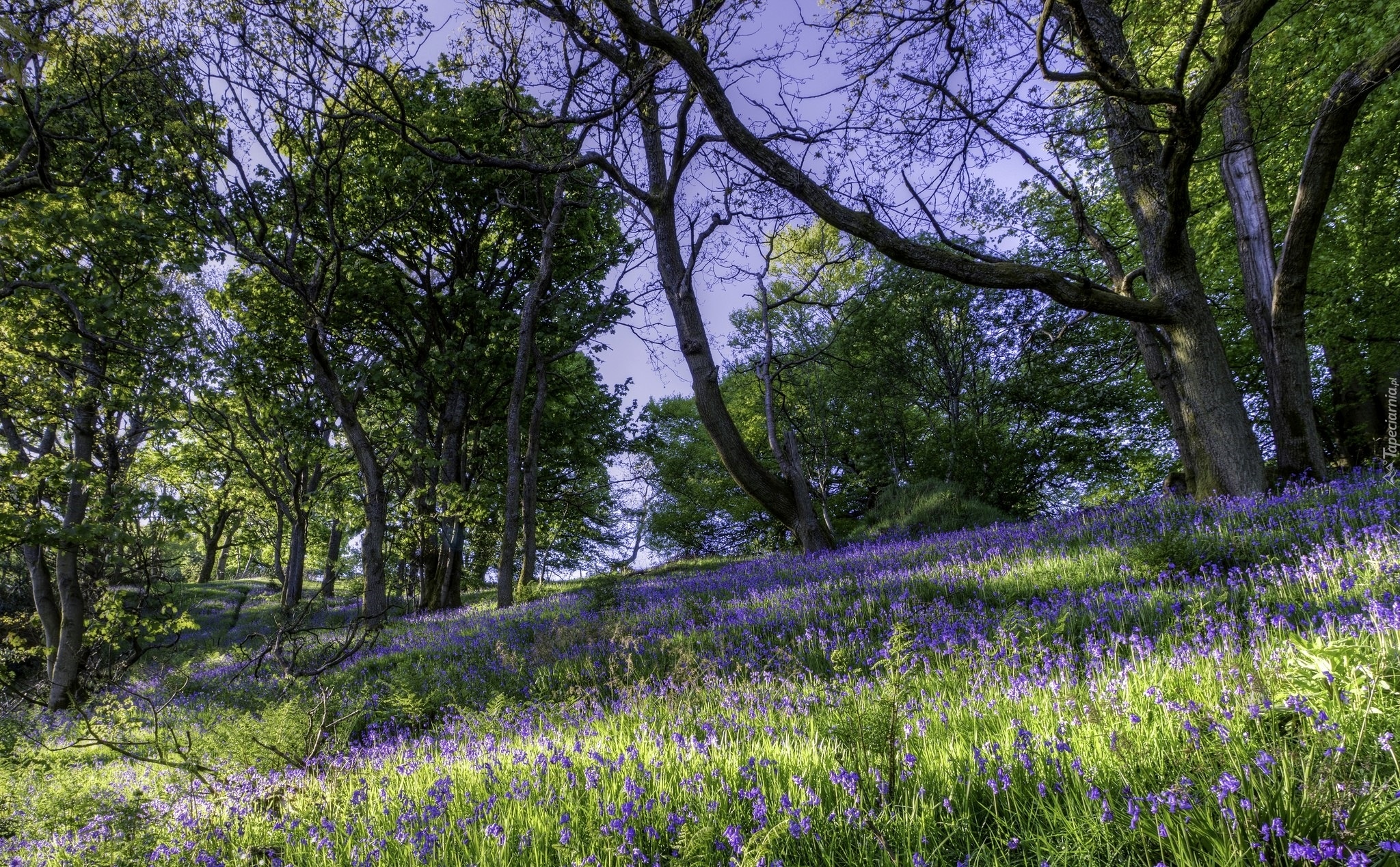Edytor tapety: Fioletowe kwiaty na leśnej polanie w słońcu