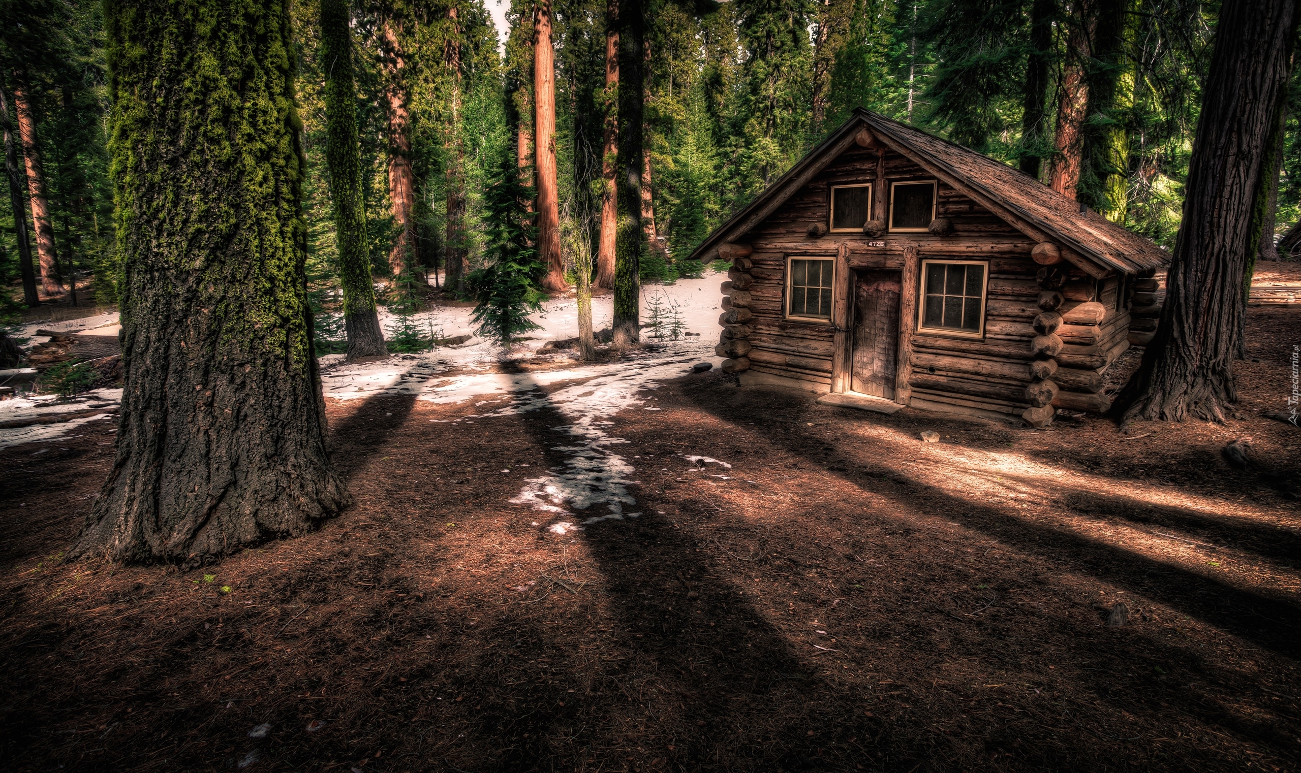 Edytor tapety: Drewniany domek wśród drzew w lesie