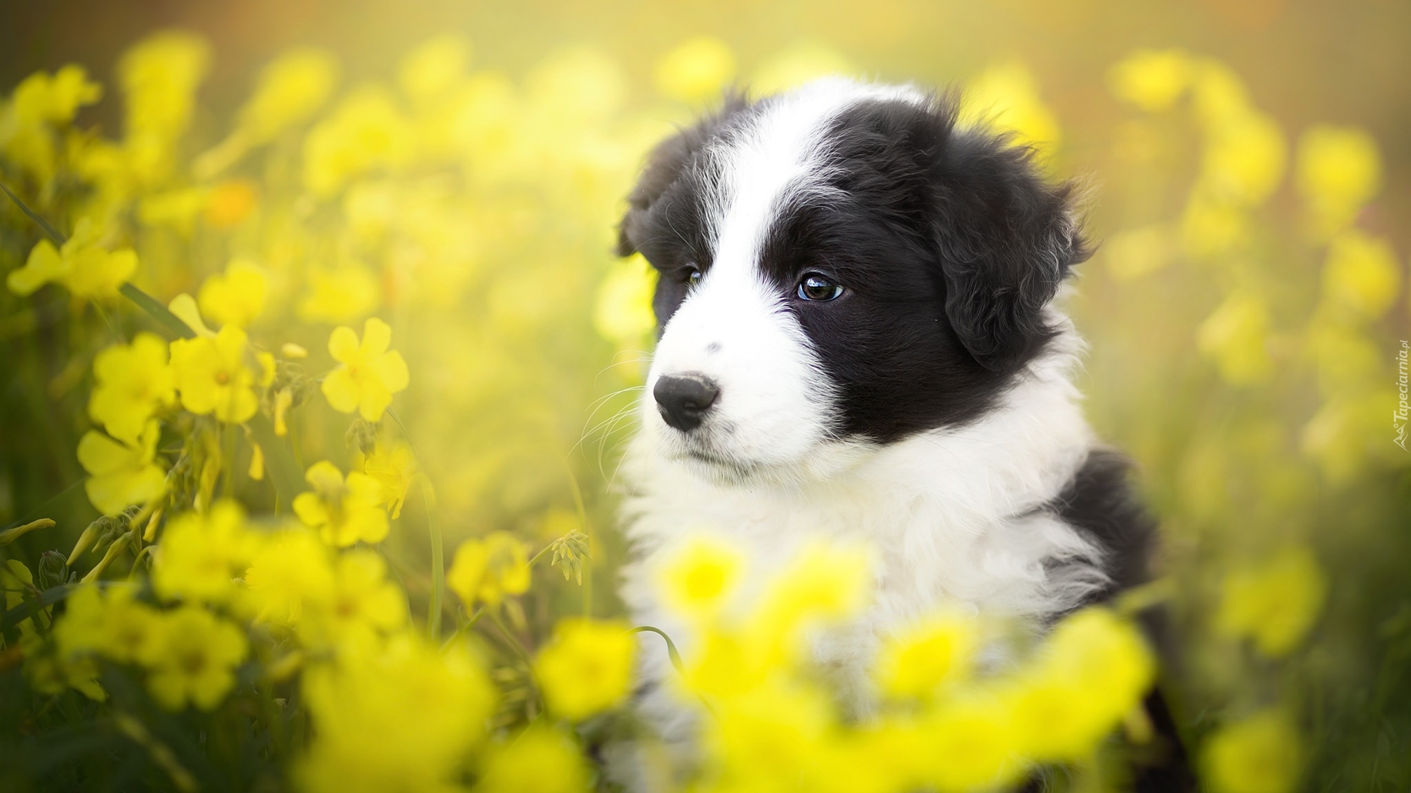 Edytor tapety: Szczeniak border collie pośród żółtych kwiatów