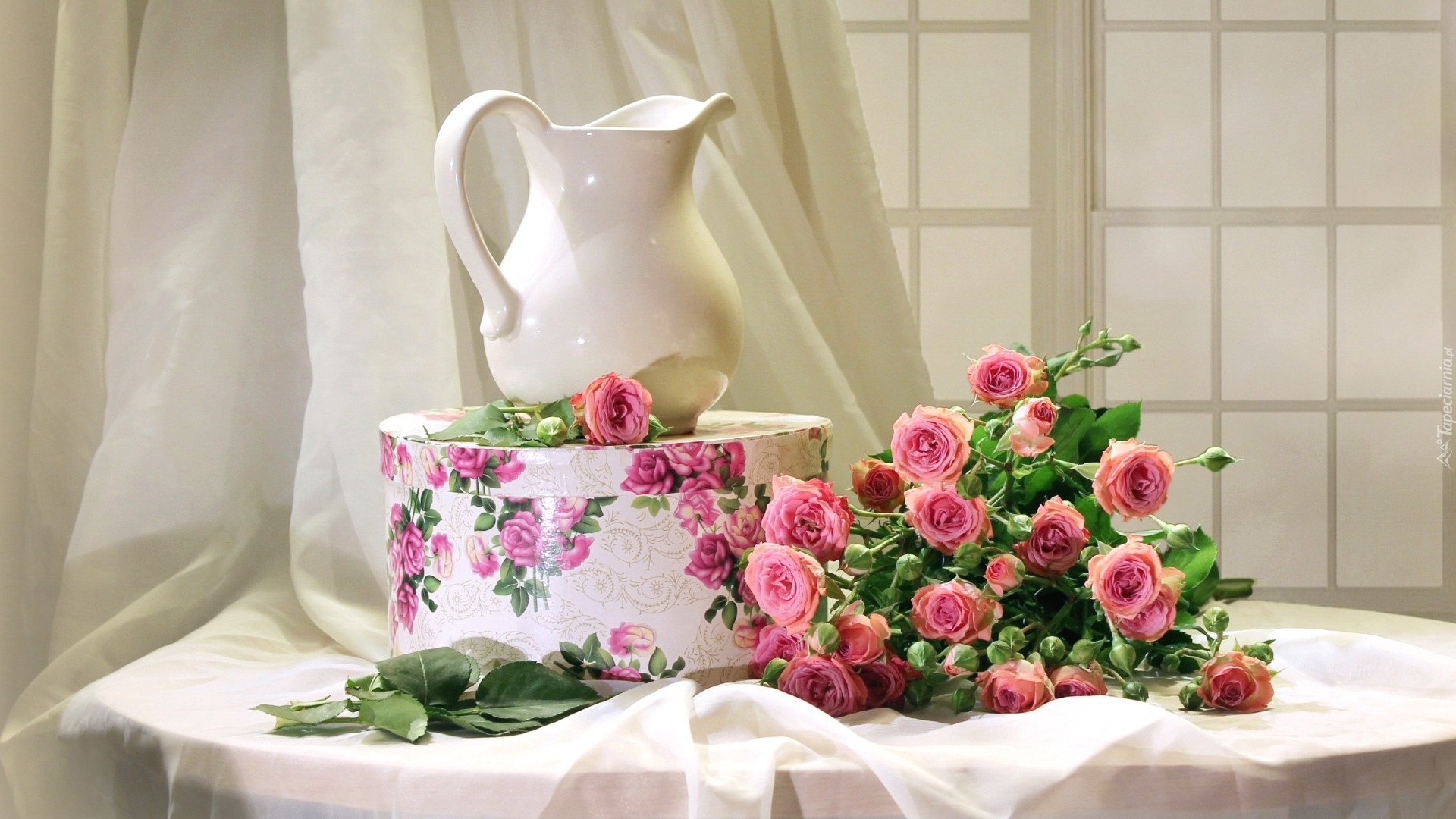 Edytor tapety: Bukiet róż obok dzbanka postawionego na pudle