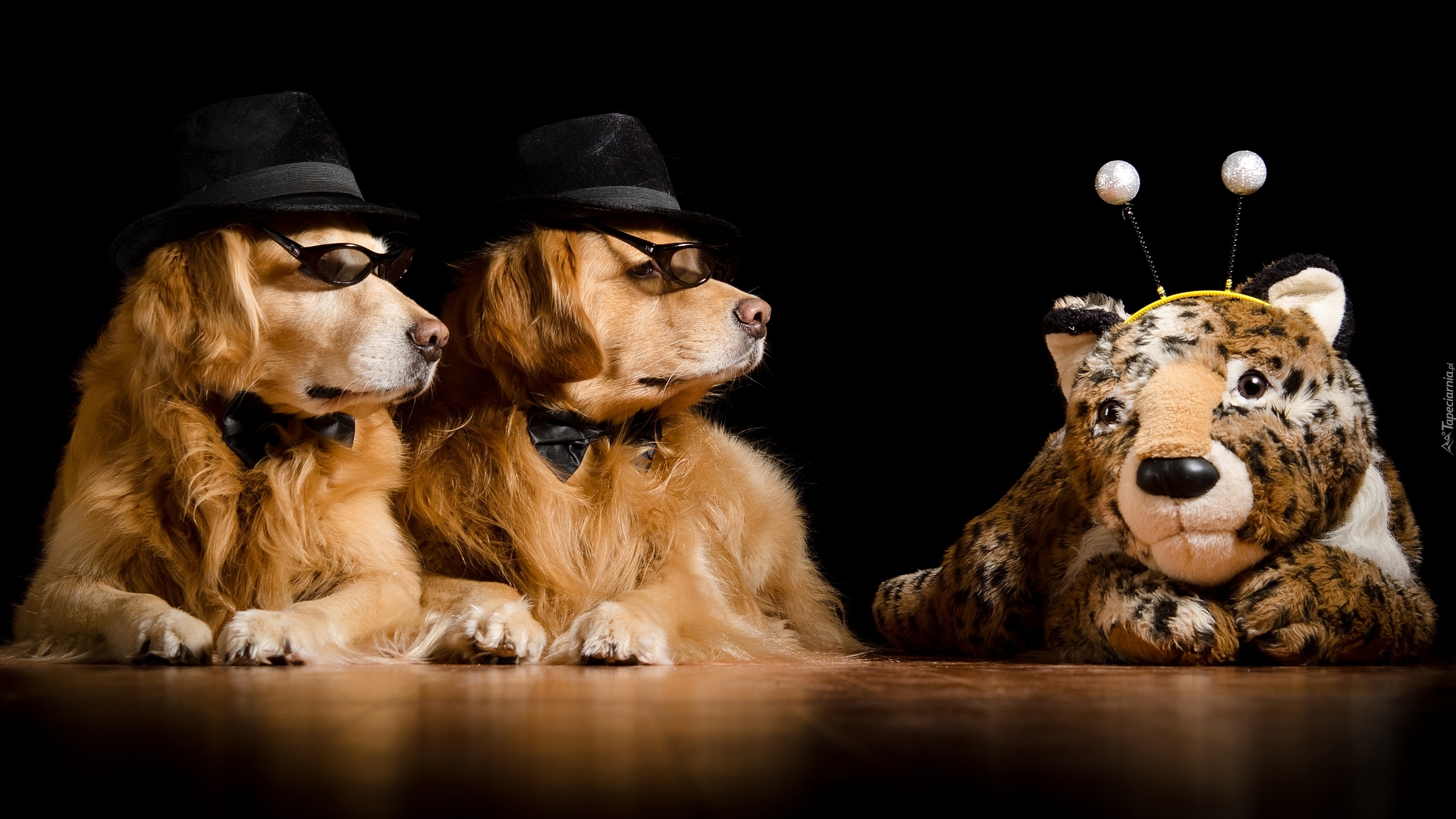 Edytor tapety: Dwa golden retrievery patrzą na maskotkę zwierzaka