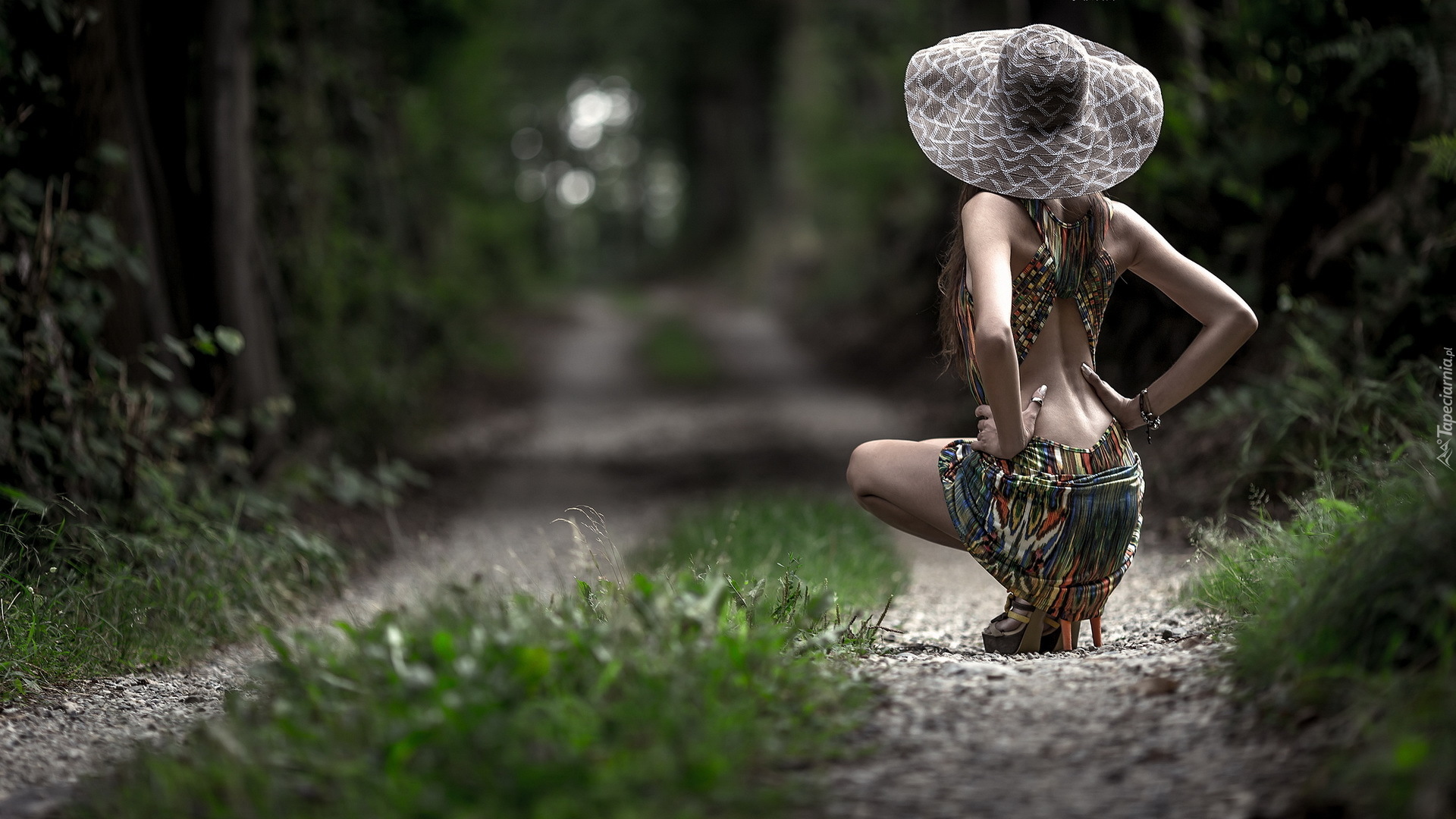 Edytor tapety: Kobieta w sukience i kapeluszu na drodze