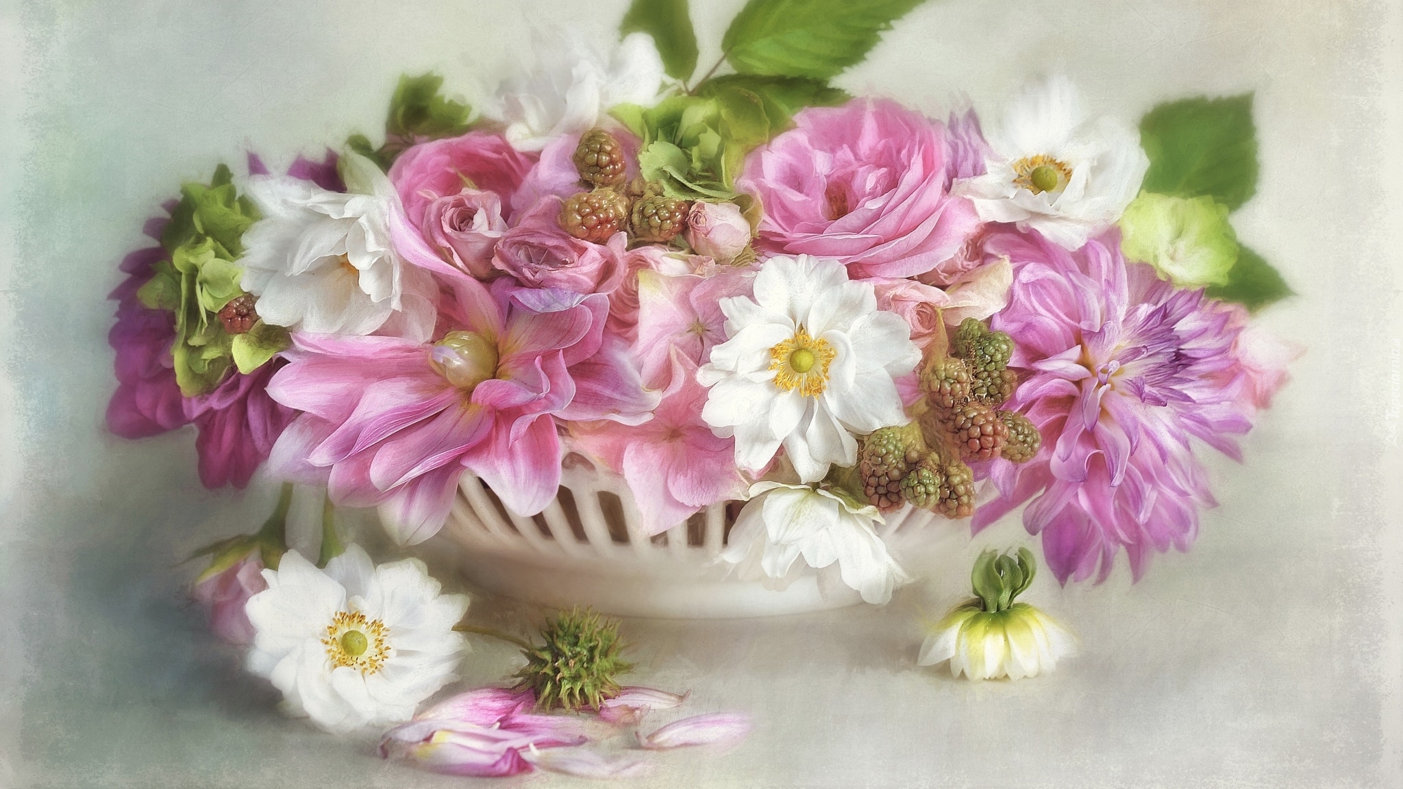 Edytor tapety: Białe i różowe kwiaty w porcelanowym naczyniu