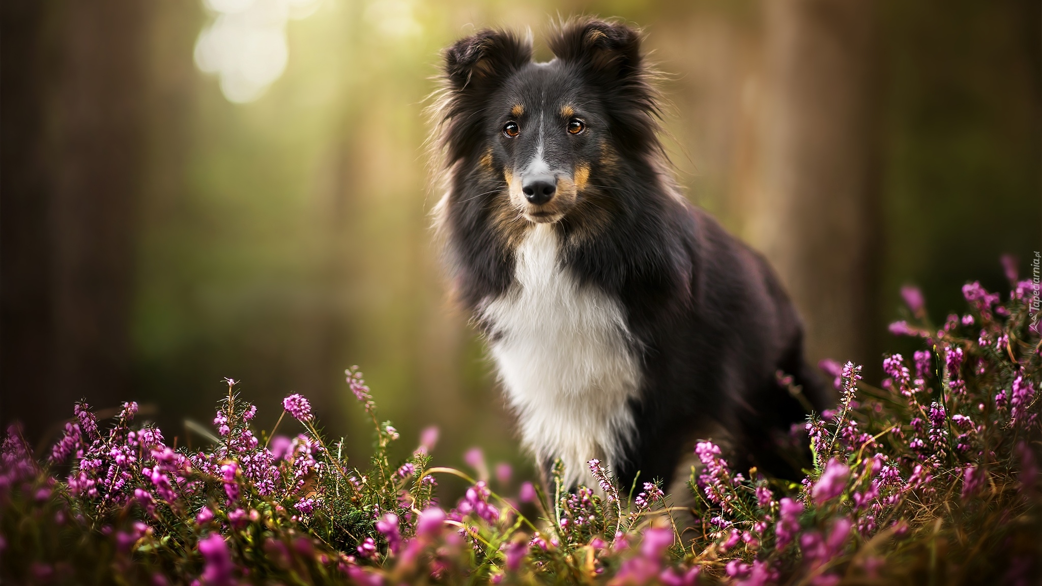 Edytor tapety: Owczarek szetlandzki we wrzosach