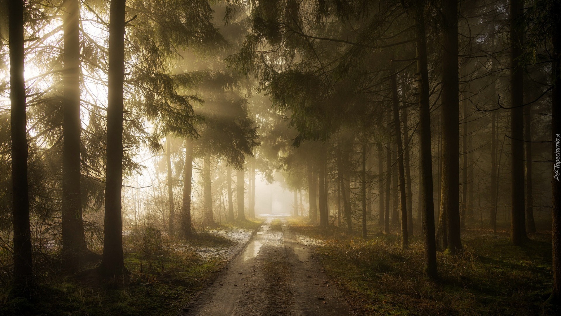 Edytor tapety: Przebijające światło i kałuże na leśnej drodze