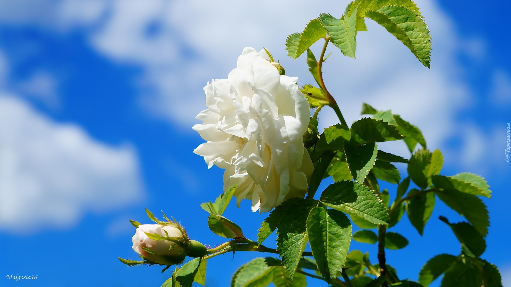 Edytor tapety: Biała róża na tle niebieskiego nieba