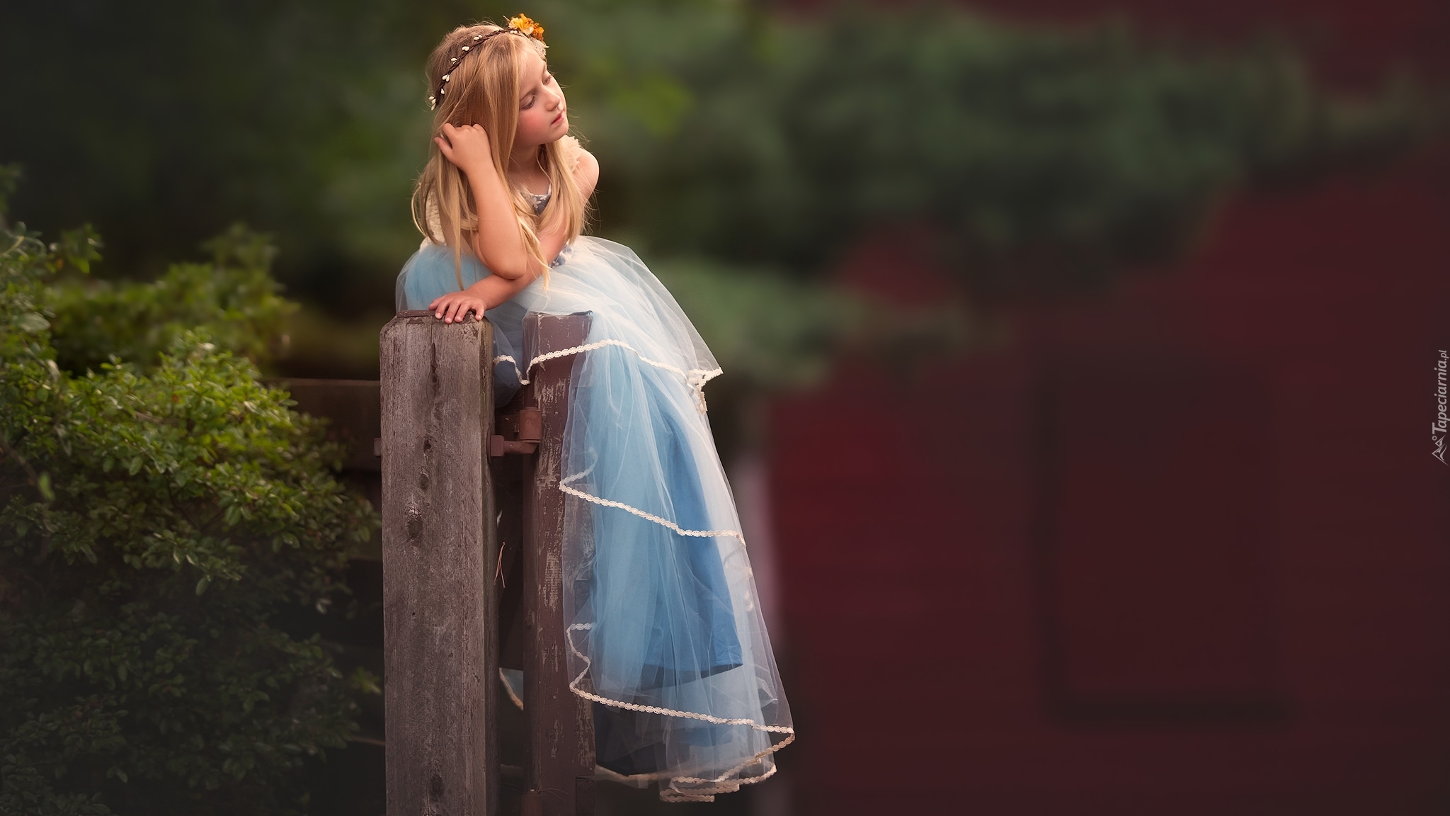 Edytor tapety: Dziewczynka w tiulowej sukience siedzi na drewnianym płocie