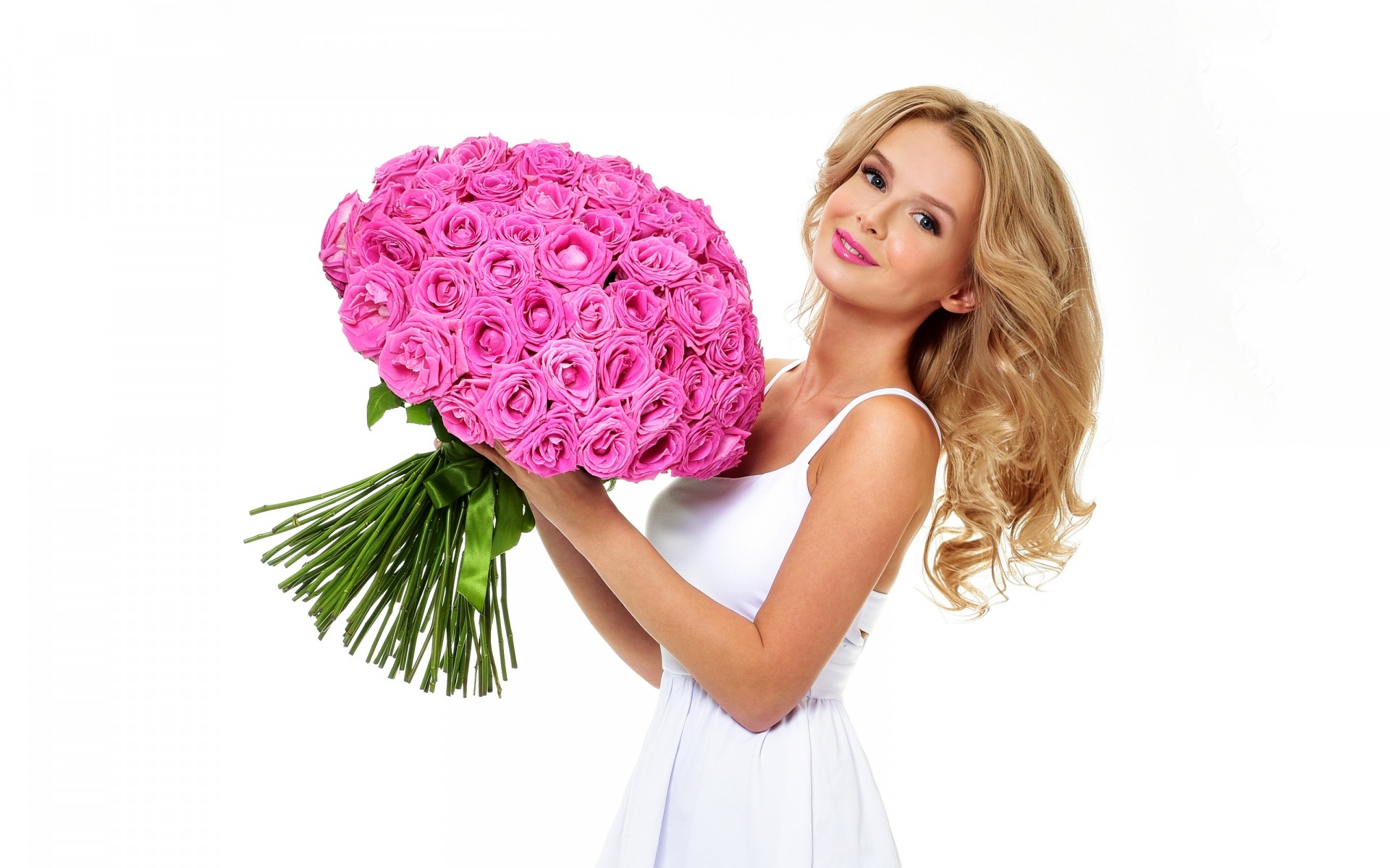 Edytor tapety: Bukiet różowych róż w dłoniach uśmiechniętej blondynki