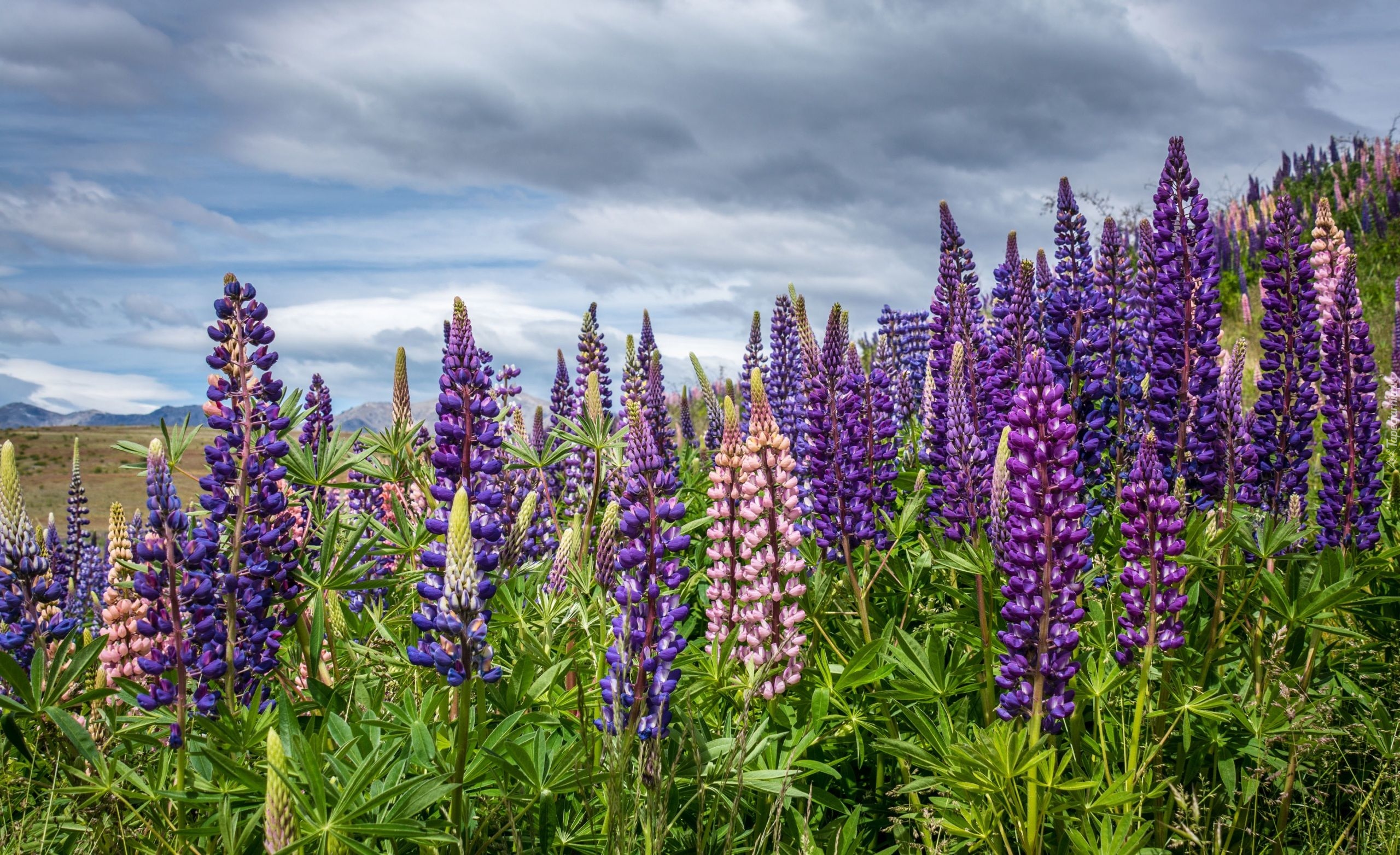 Edytor tapety: Fioletowy i różowy łubin na łące