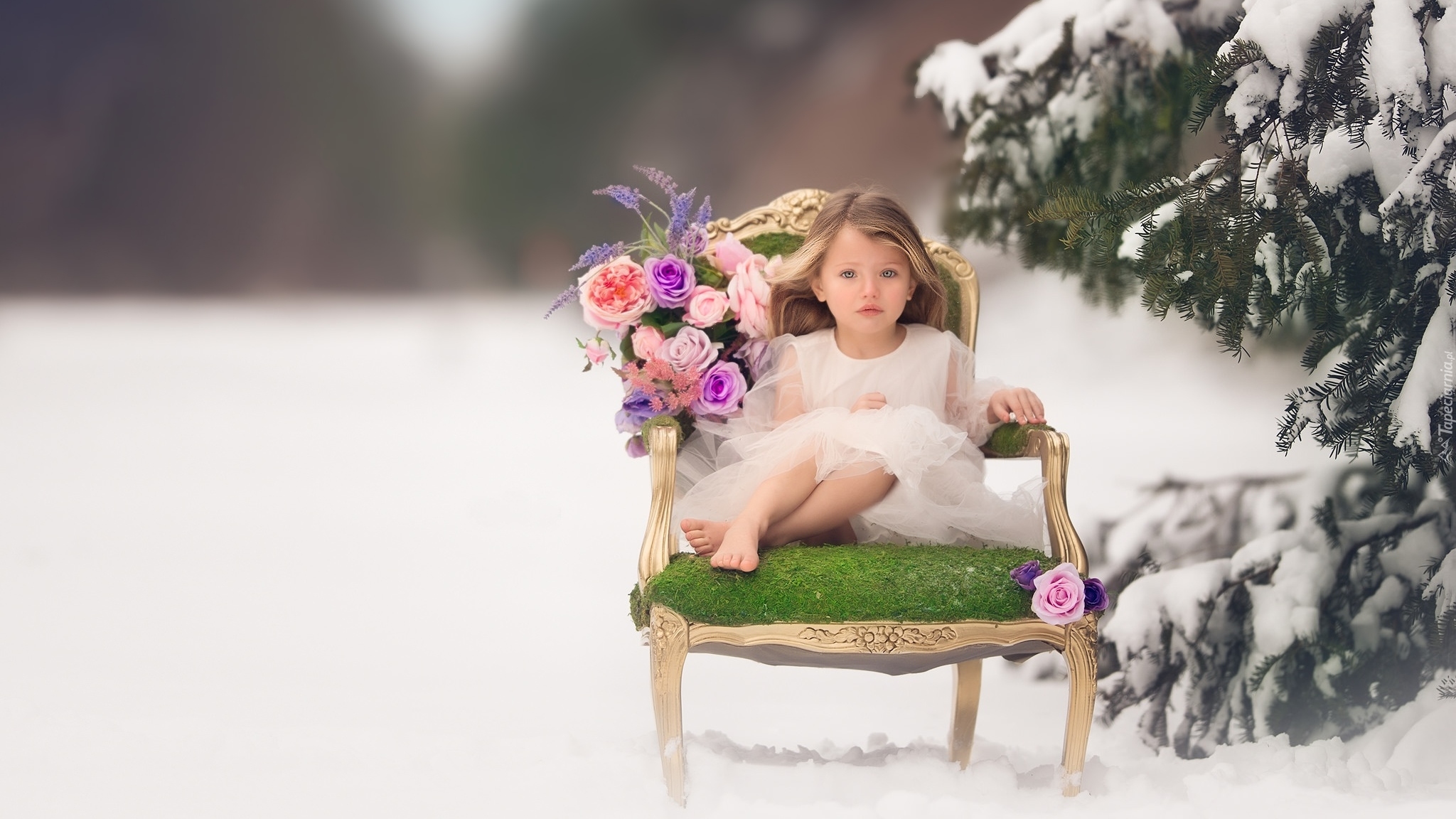 Edytor tapety: Dziewczynka w białej zwiewnej sukieneczce siedzi na fotelu