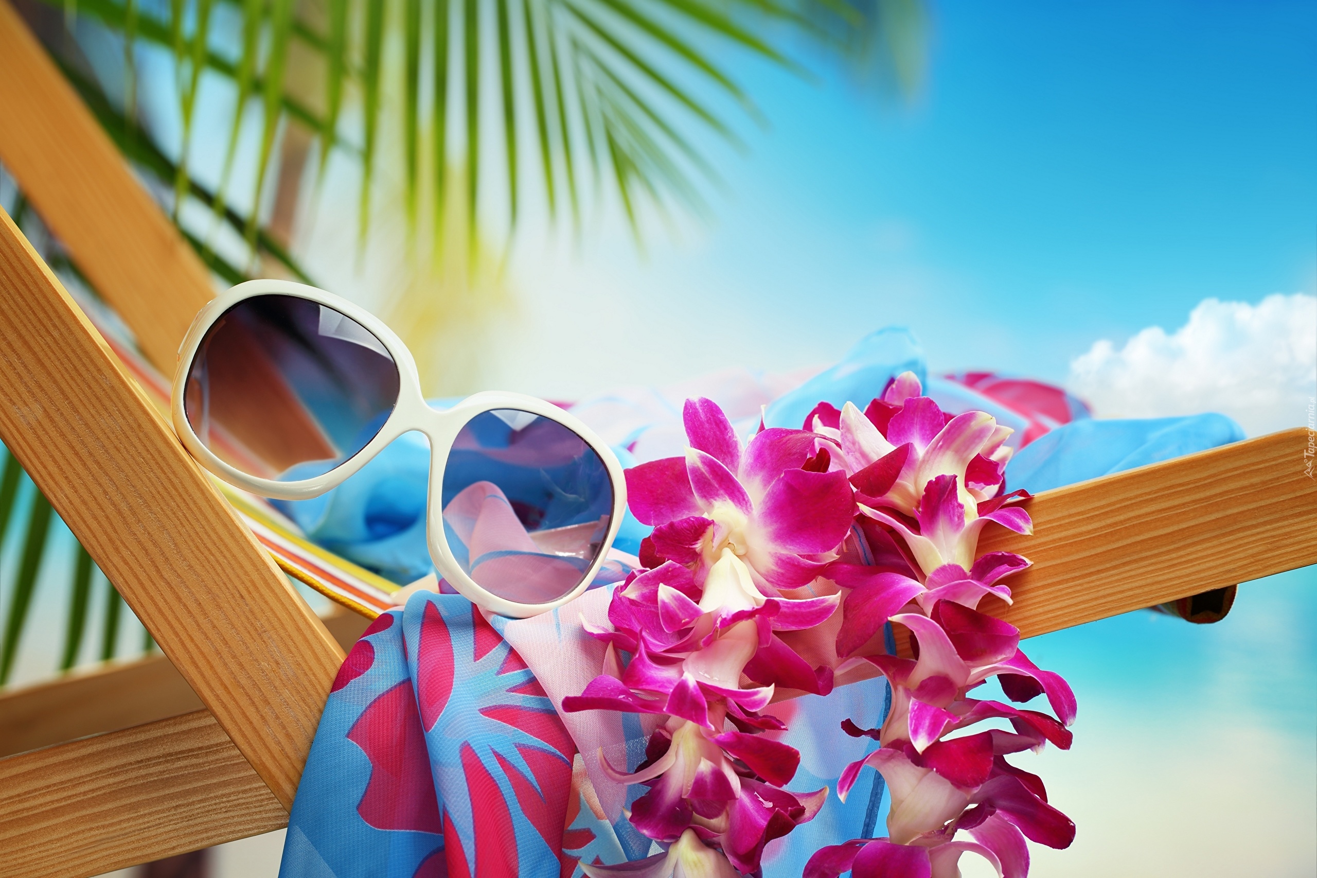 Edytor tapety: Okulary przeciwsłoneczne i kwiaty położone na leżaku