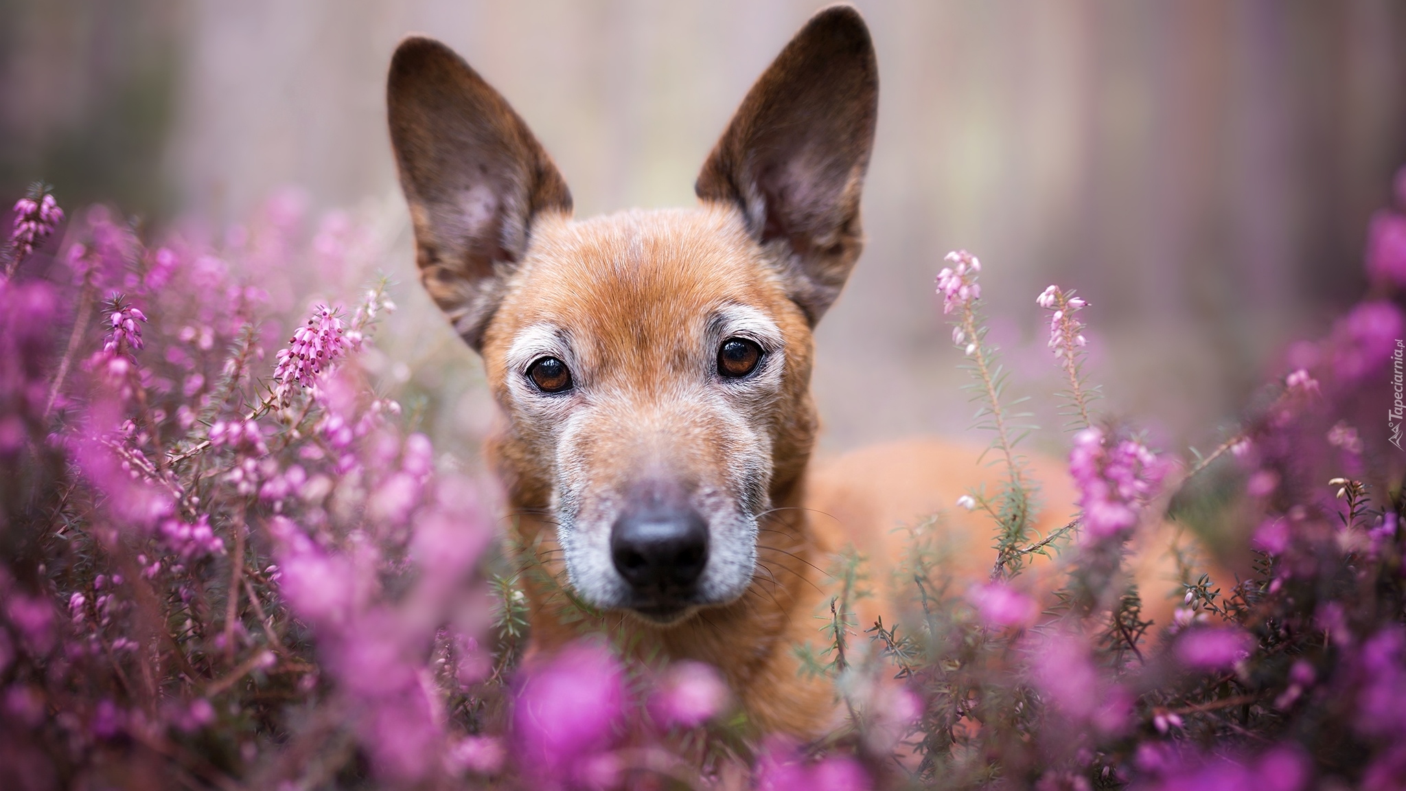 Edytor tapety: Kundelek z mordką we wrzosach