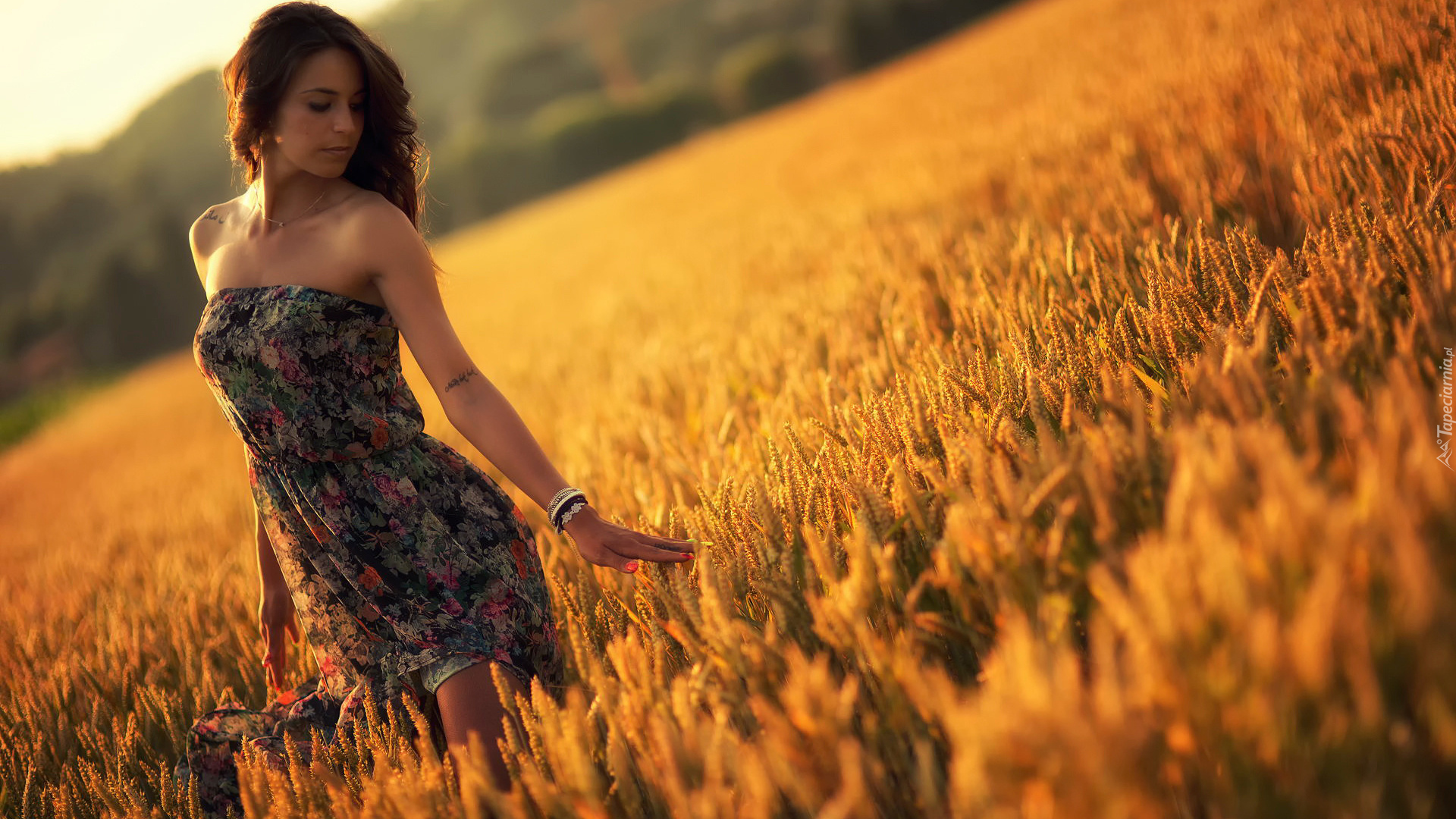 Edytor tapety: Dziewczyna w kolorowej sukience spaceruje w zbożu