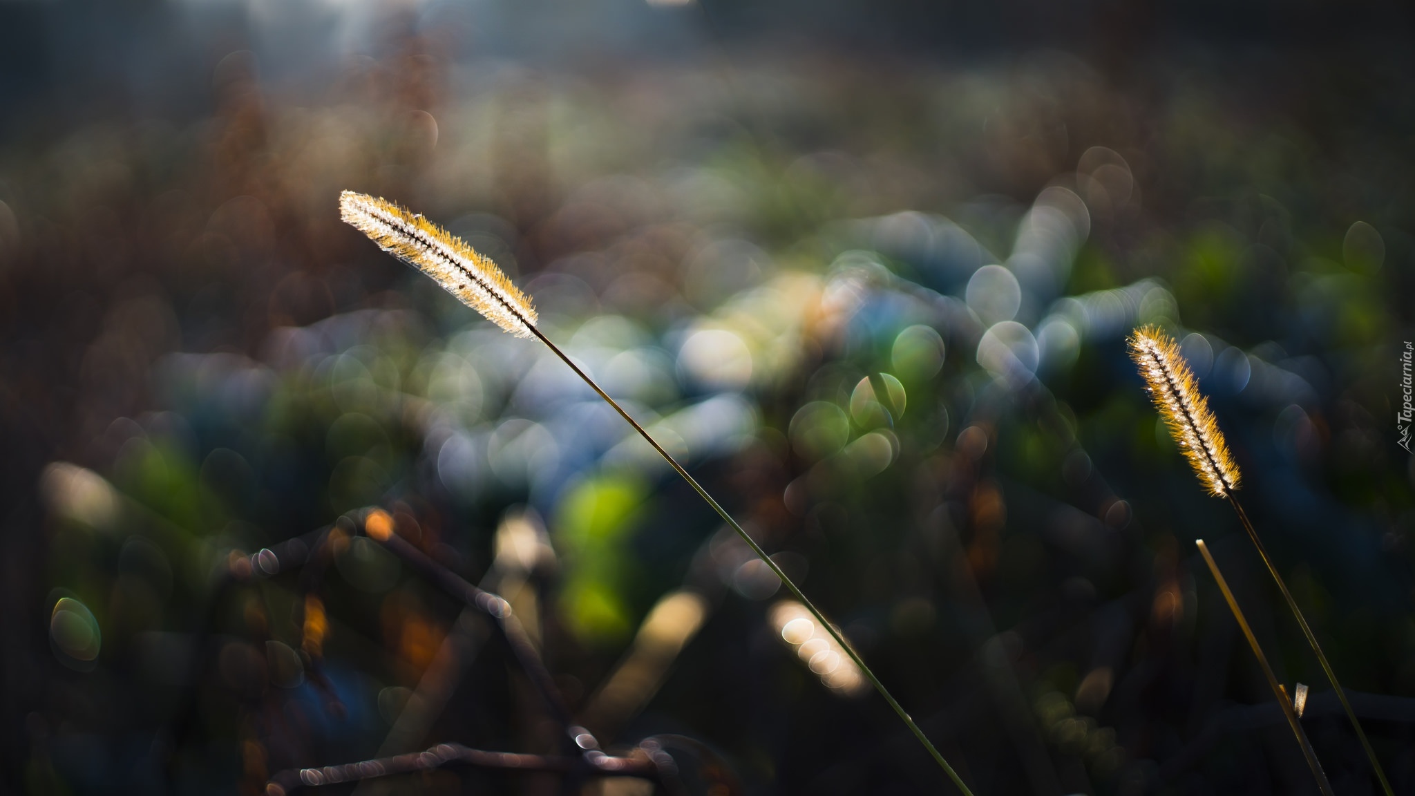Edytor tapety: Źdźbła trawy w blasku światła na rozmytym tle