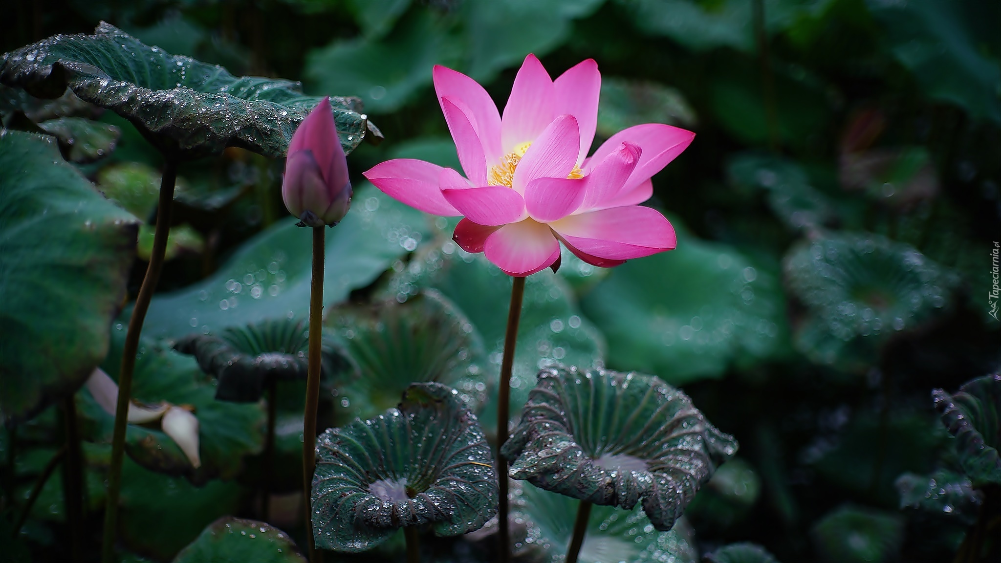 Edytor tapety: Rozwinięty kwiat lotosu i krople rosy na liściach