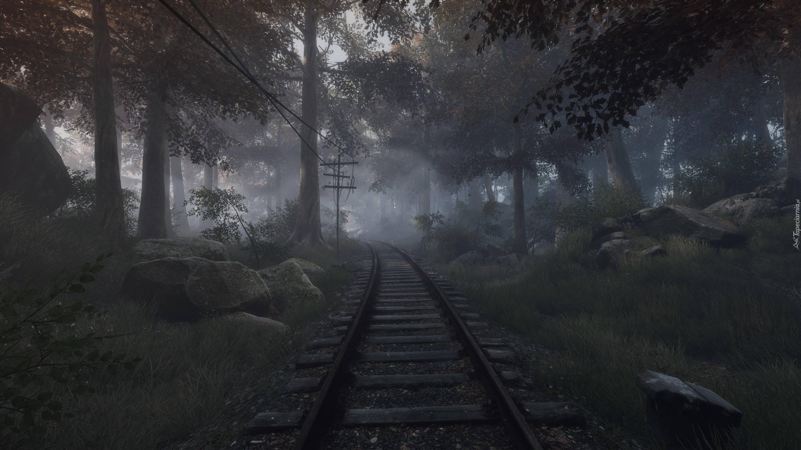 Edytor tapety: Kamienie obok torów kolejowych prowadzących przez las