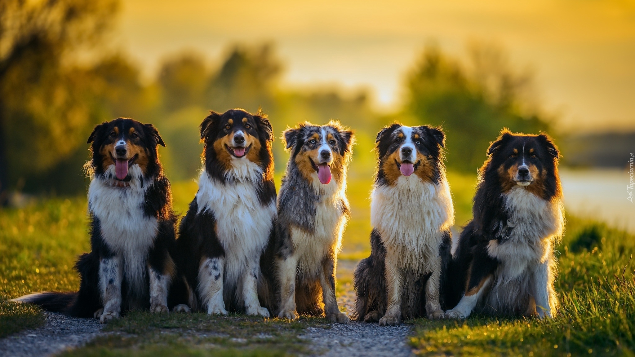 Edytor tapety: Pięć owczarków australijskich na drodze