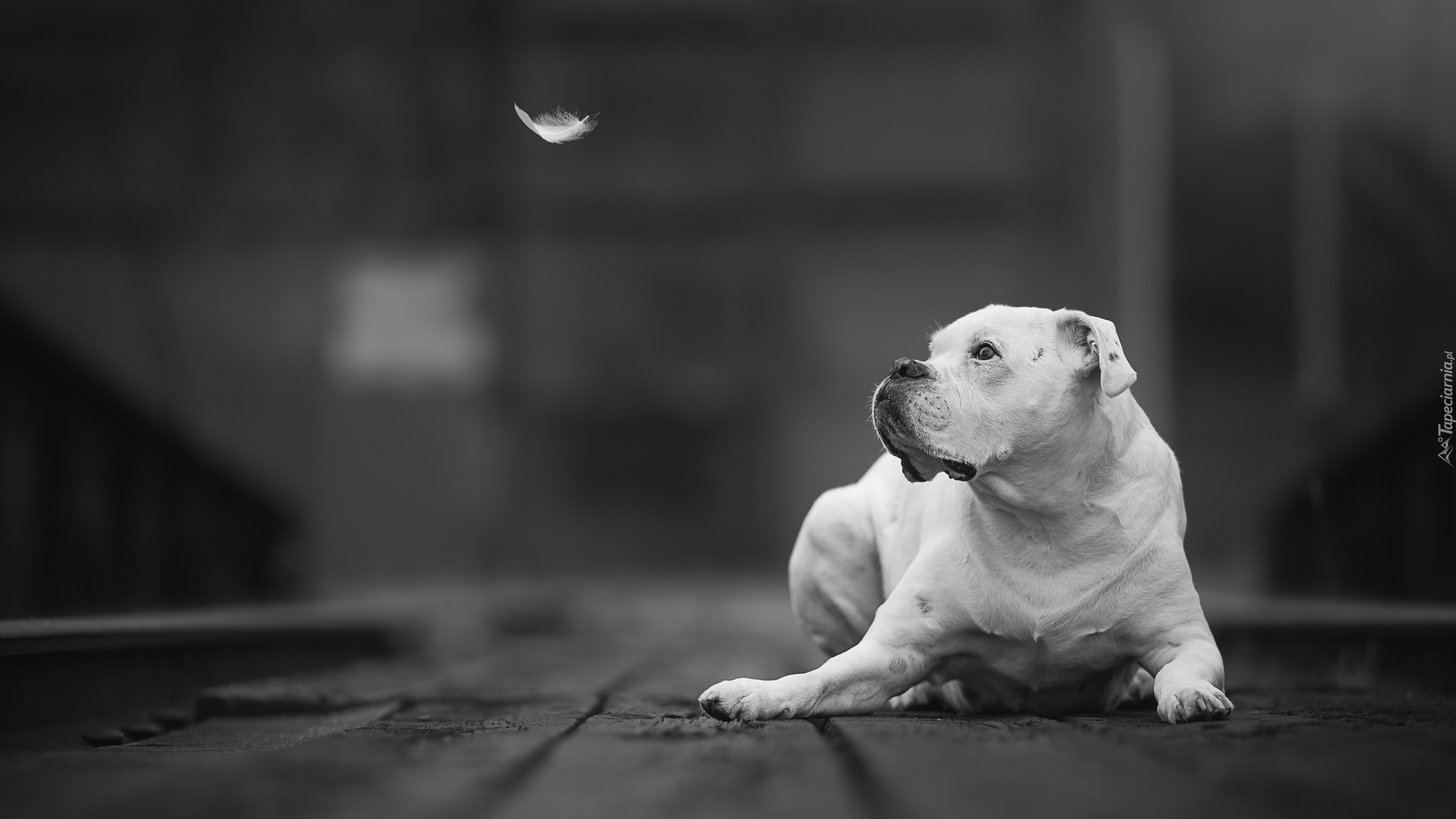 Edytor tapety: Pies rasy bokser obserwuje opadające piórko