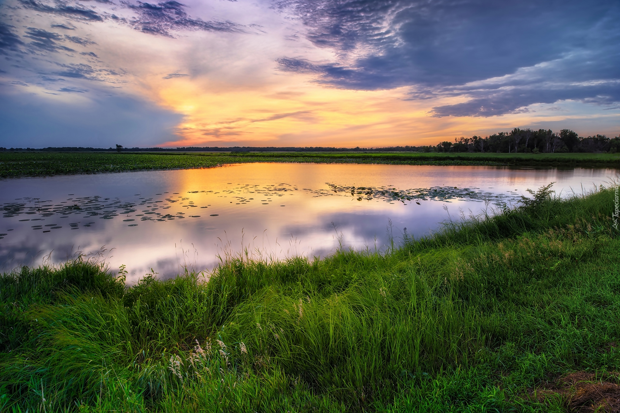 Edytor tapety: Jezioro i trawa w blasku zachodzącego słońca