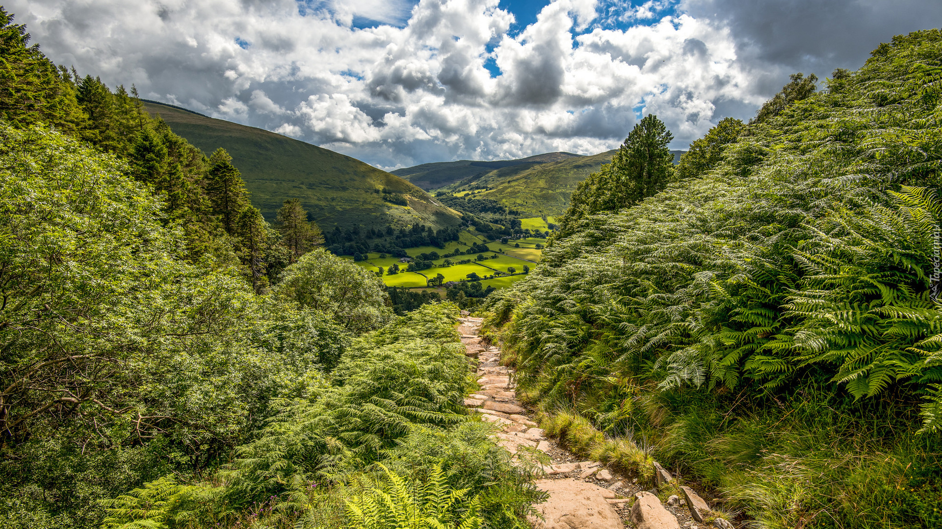 Edytor tapety: Droga pośród paproci prowadząca do górskiej doliny