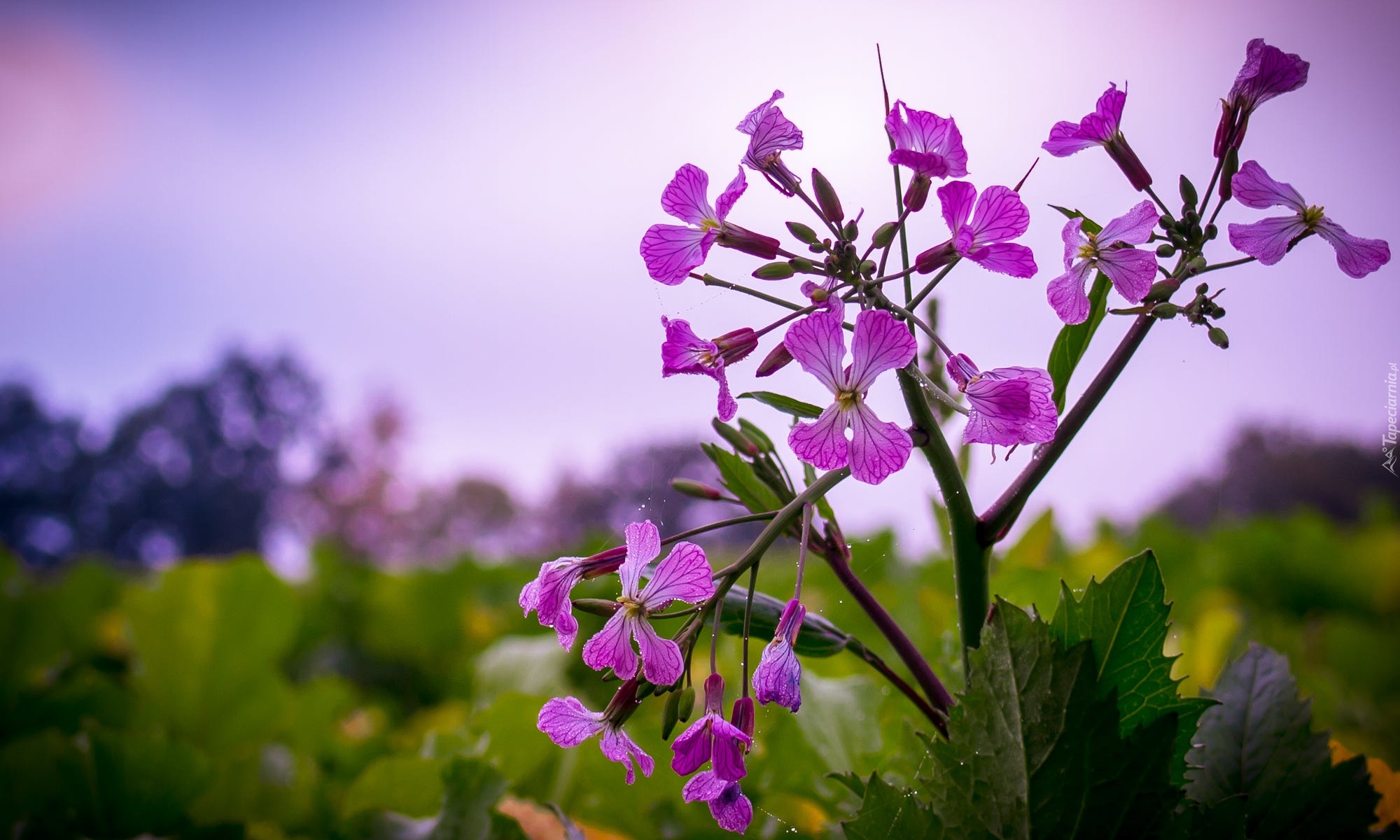 Edytor tapety: Fioletowe kwiaty w kroplach rosy