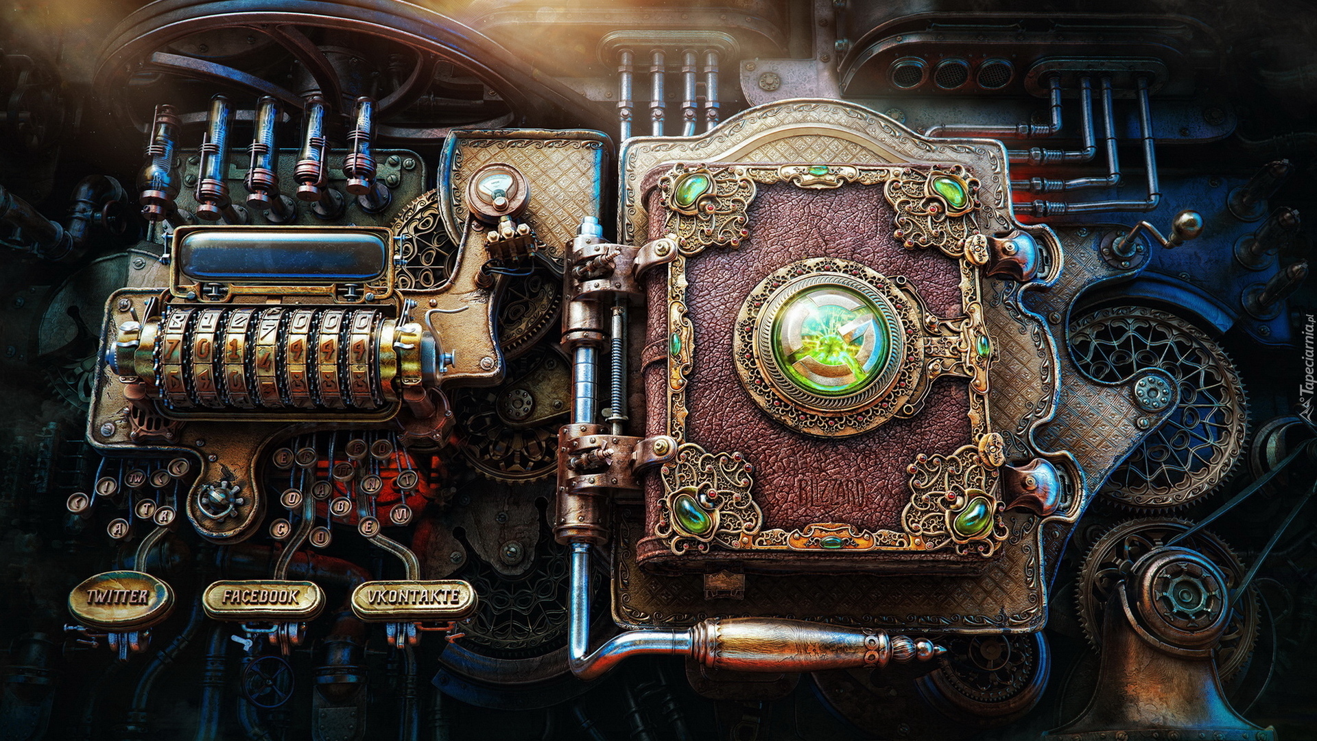 Edytor tapety: Stara księga i maszyna w grafice fantasy