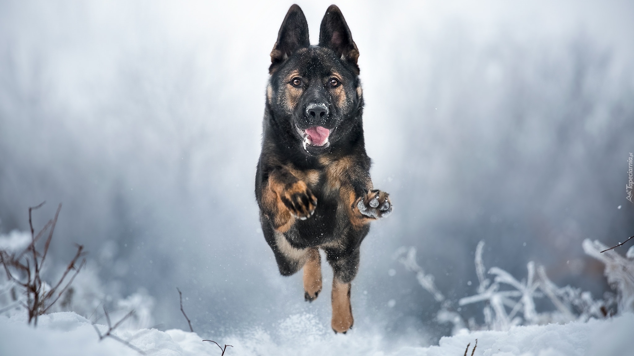 Edytor tapety: Owczarek niemiecki biegnie po śniegu