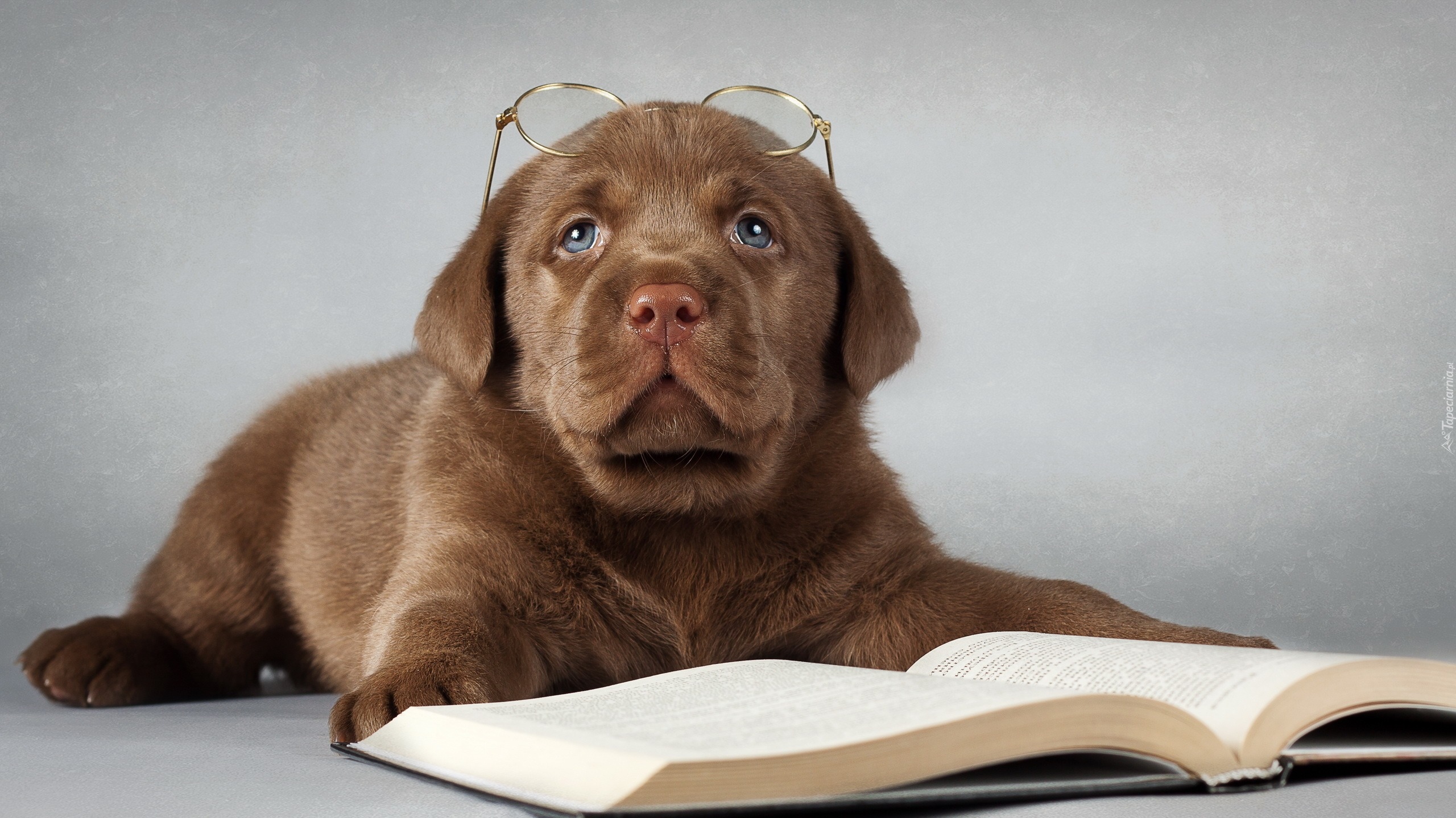 Edytor tapety: Szczeniak labradora retrievera w okularach leży przy książce