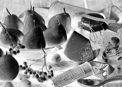 Edytor tapety: Dojrzałe gruszki na metalowym spodku z dodatkami sera i oliwy z miodem