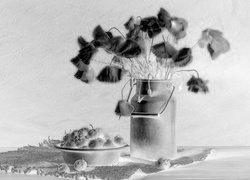 Edytor tapety: Truskawki w misce obok maków w metalowej kance