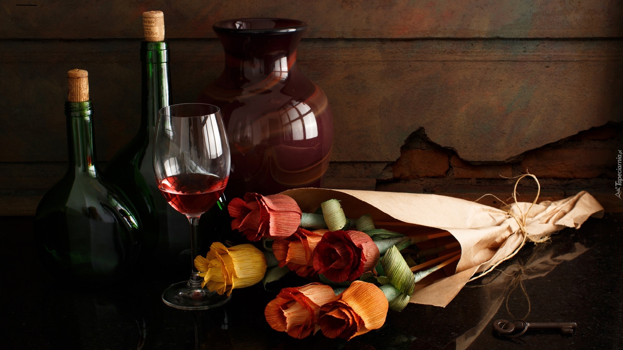 Edytor tapety: Butelki i kieliszek z winem obok bukietu róż
