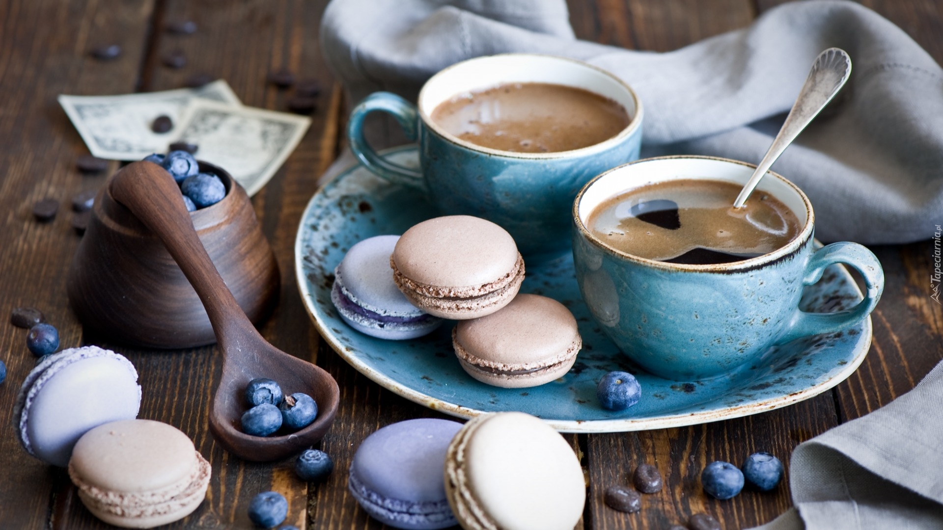 Edytor tapety: Kompozycja z kawą, ciastkami i borówkami