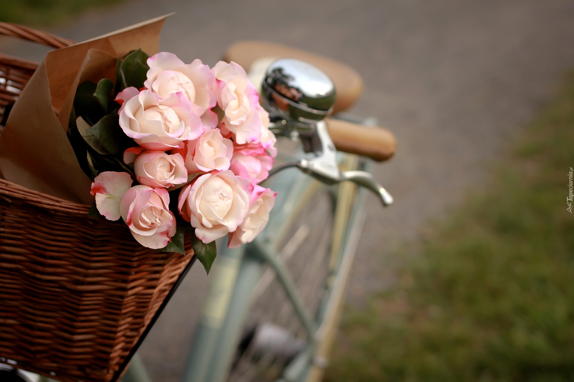 Edytor tapety: Bukiet róż w koszyku na rowerze