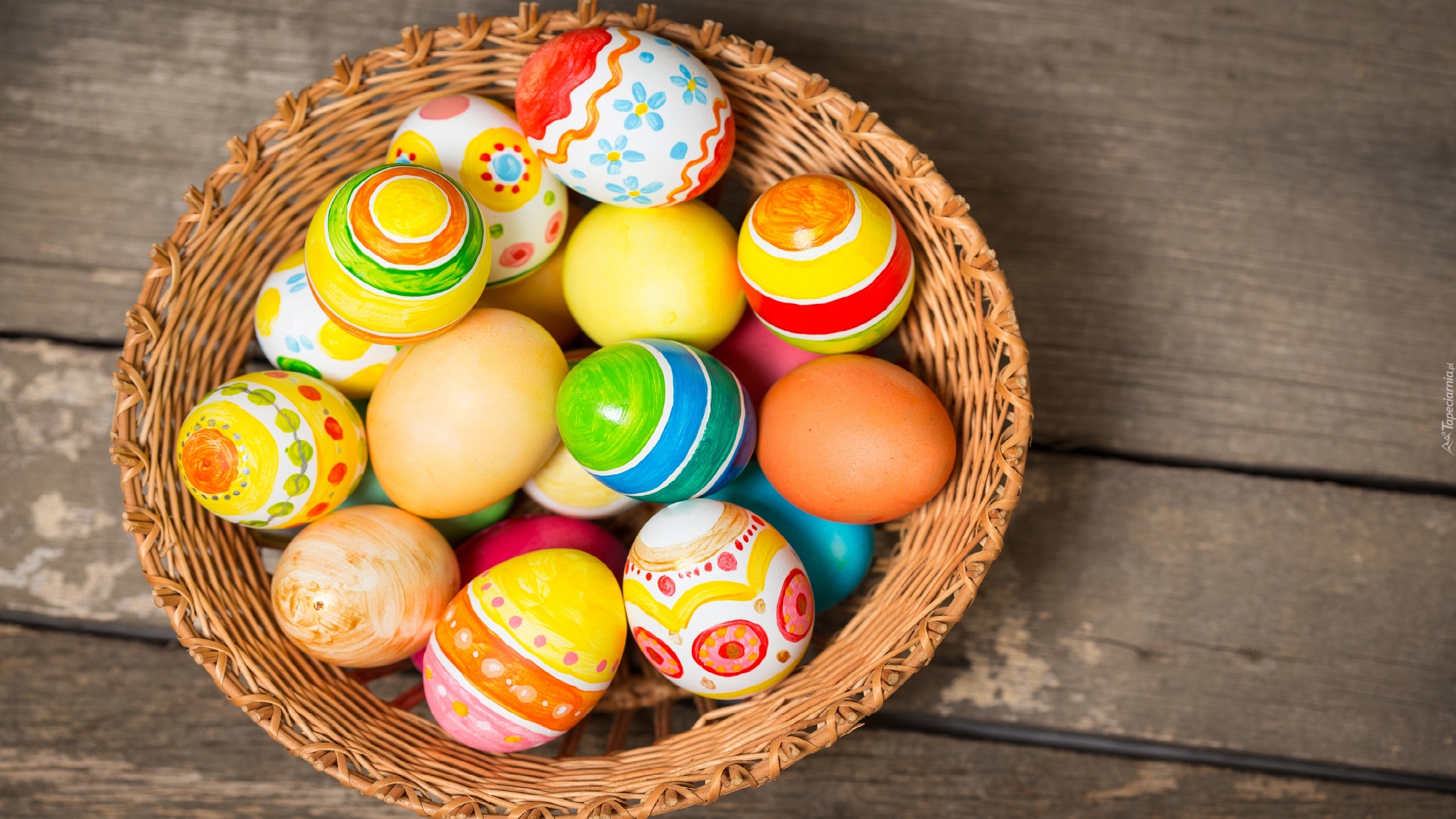 Edytor tapety: Kolorowe pisanki w koszyczku postawionym na deskach