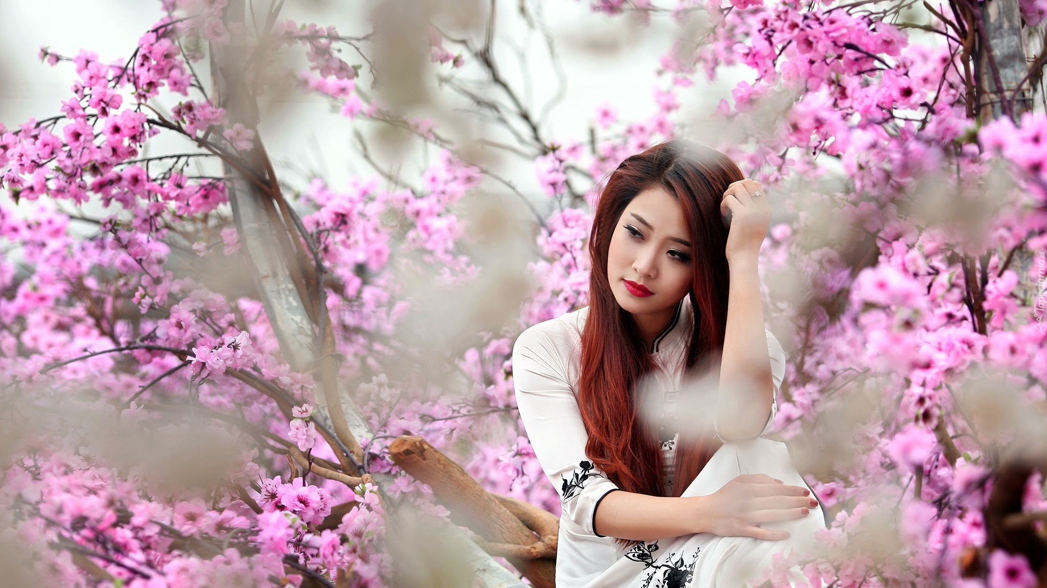 Edytor tapety: Zamyślona Azjatka przy kwitnącym drzewie