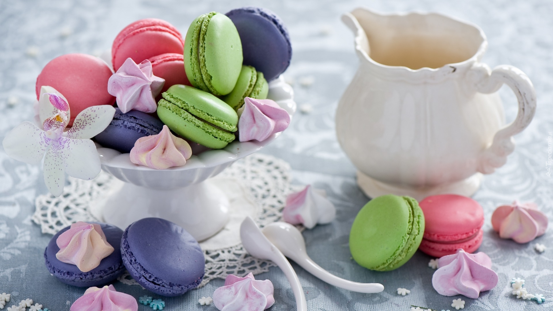 Edytor tapety: Ciastka makaroniki i bezy na paterze obok dzbanuszka