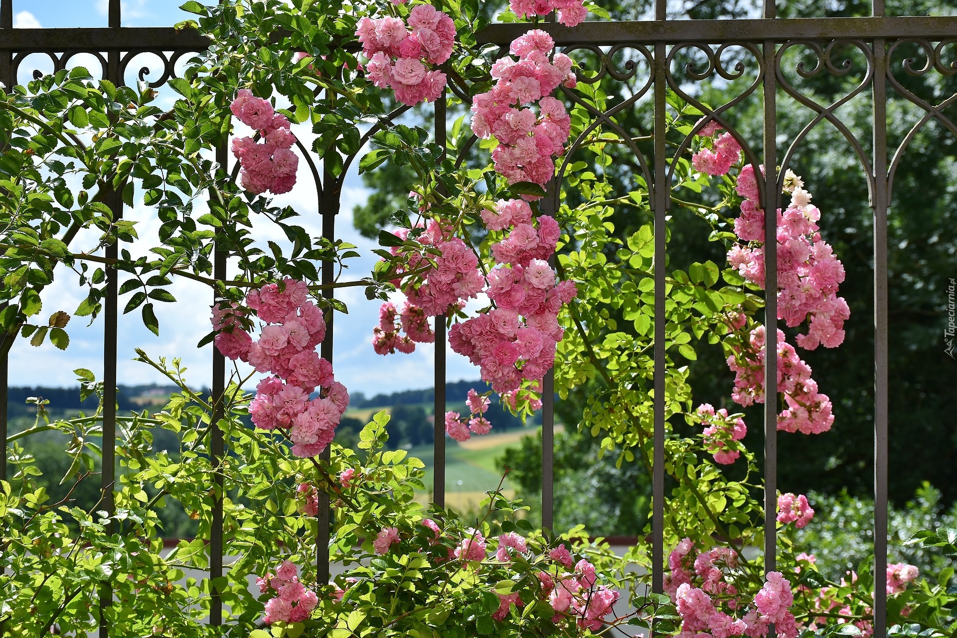 Edytor tapety: Różowe róże oplatające metalowe ogrodzenie