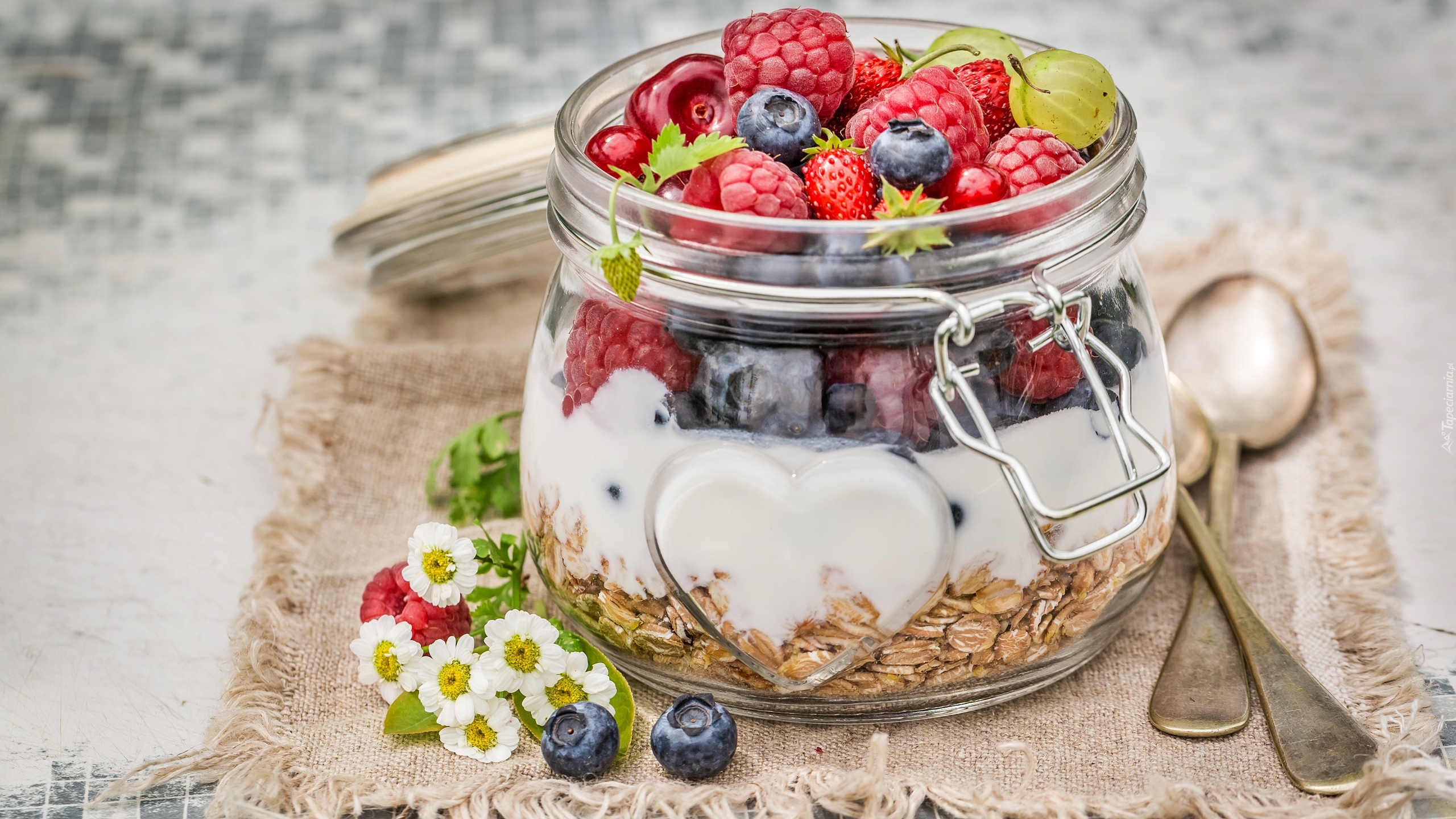 Edytor tapety: Dekoracyjny słoik z owocami, jogurtem i płatkami