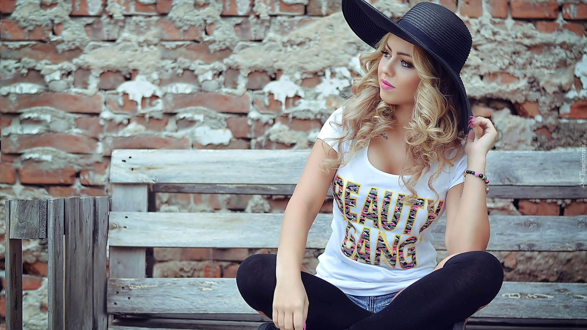 Edytor tapety: Blondynka w czarnym kapeluszu siedząca na ławeczce